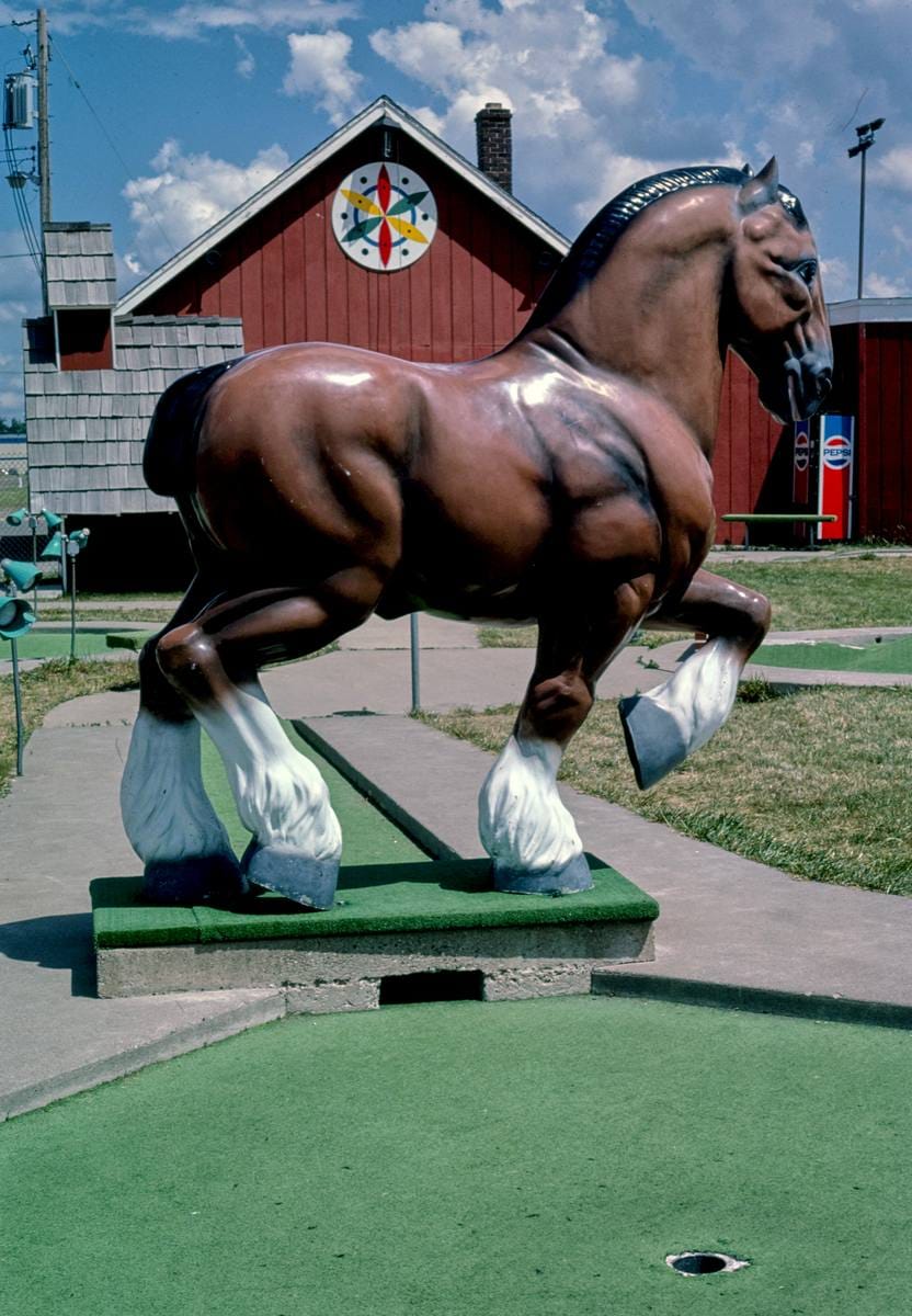 Historic Photo : 1984 Clydesdale horse, Fairway Golf, 1700 Como Avenue, St. Paul, Minnesota | Margolies | Roadside America Collection | Vintage Wall Art :