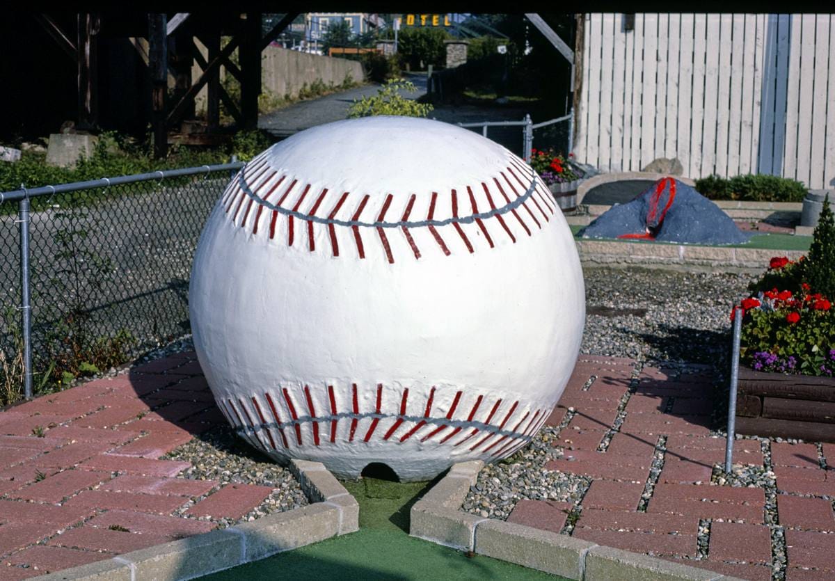 Historic Photo : 1984 Giant baseball hole, Salute to the USA mini golf, Lake Winnipesaukee Pier, Weirs Beach, New Hampshire | Photo by: John Margolies |