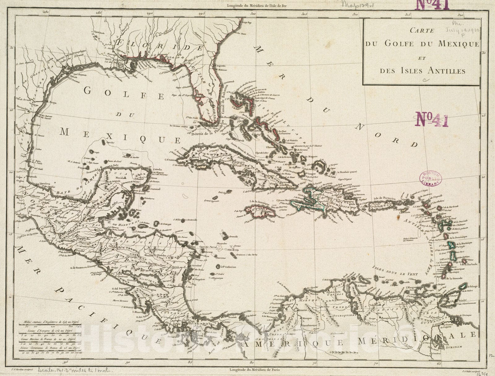 • .Historical Map, 1797-1801 Carte du Golfe du Mexique et des Isles Antilles, Vintage Wall Art
