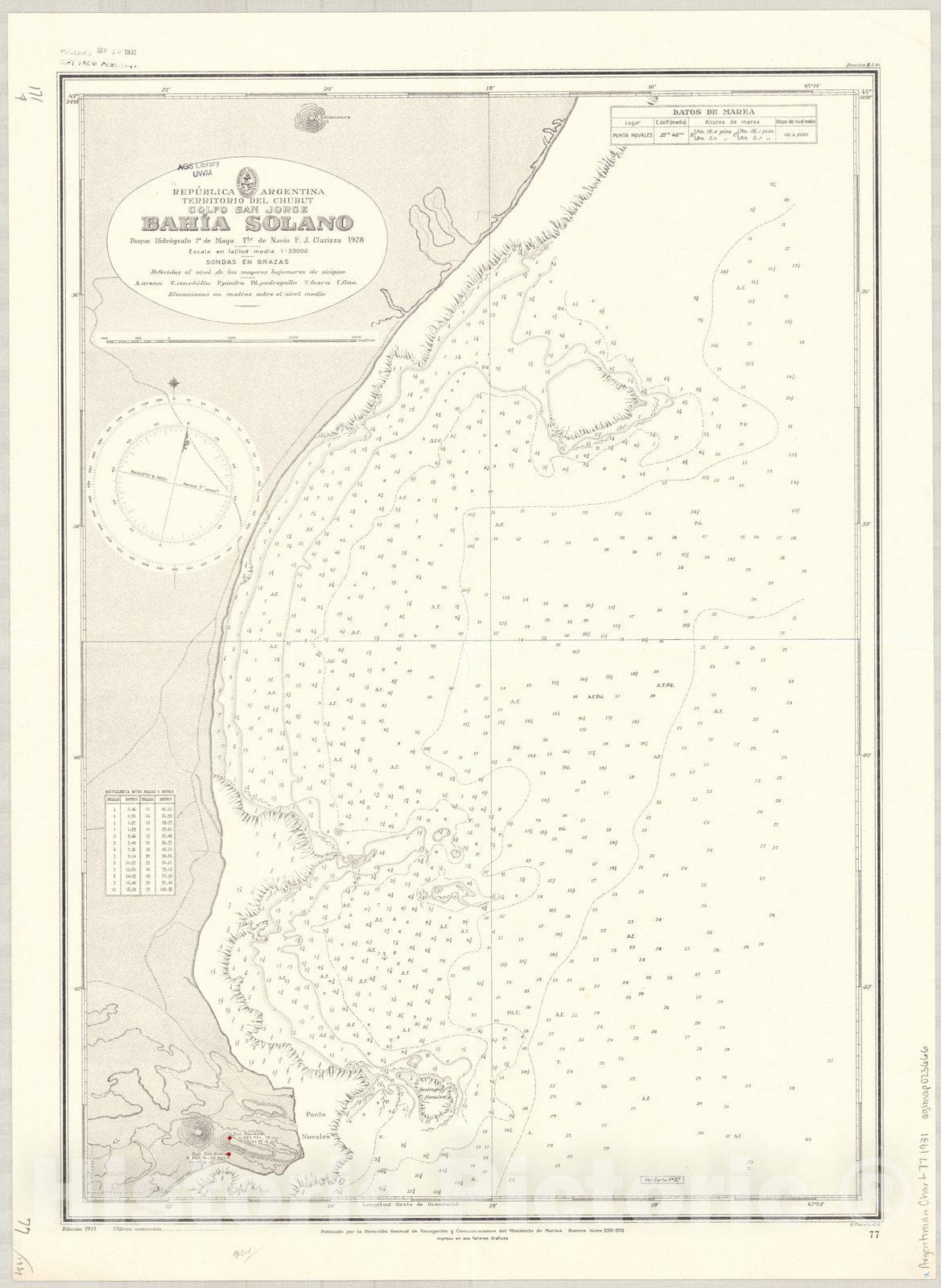 Republica Argentina, Territorio del Chubut, Golfo San Jorge, Bahia Solano / Buque Hidrografo 1' de Mayo Tte. de Navio F.J. Clarizza 1928 ; publicado por la Direccion General de Navegacion y Comunicaciones del Ministerio de Marina