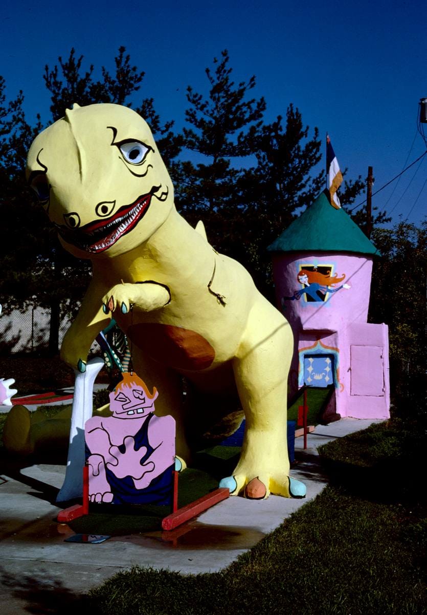 Historic Photo : 1986 Yellow dinosaur and pink castle, Sir Goony Golf, Chattanooga, Tennessee, Chattanooga, Tennessee | Photo by: John Margolies |