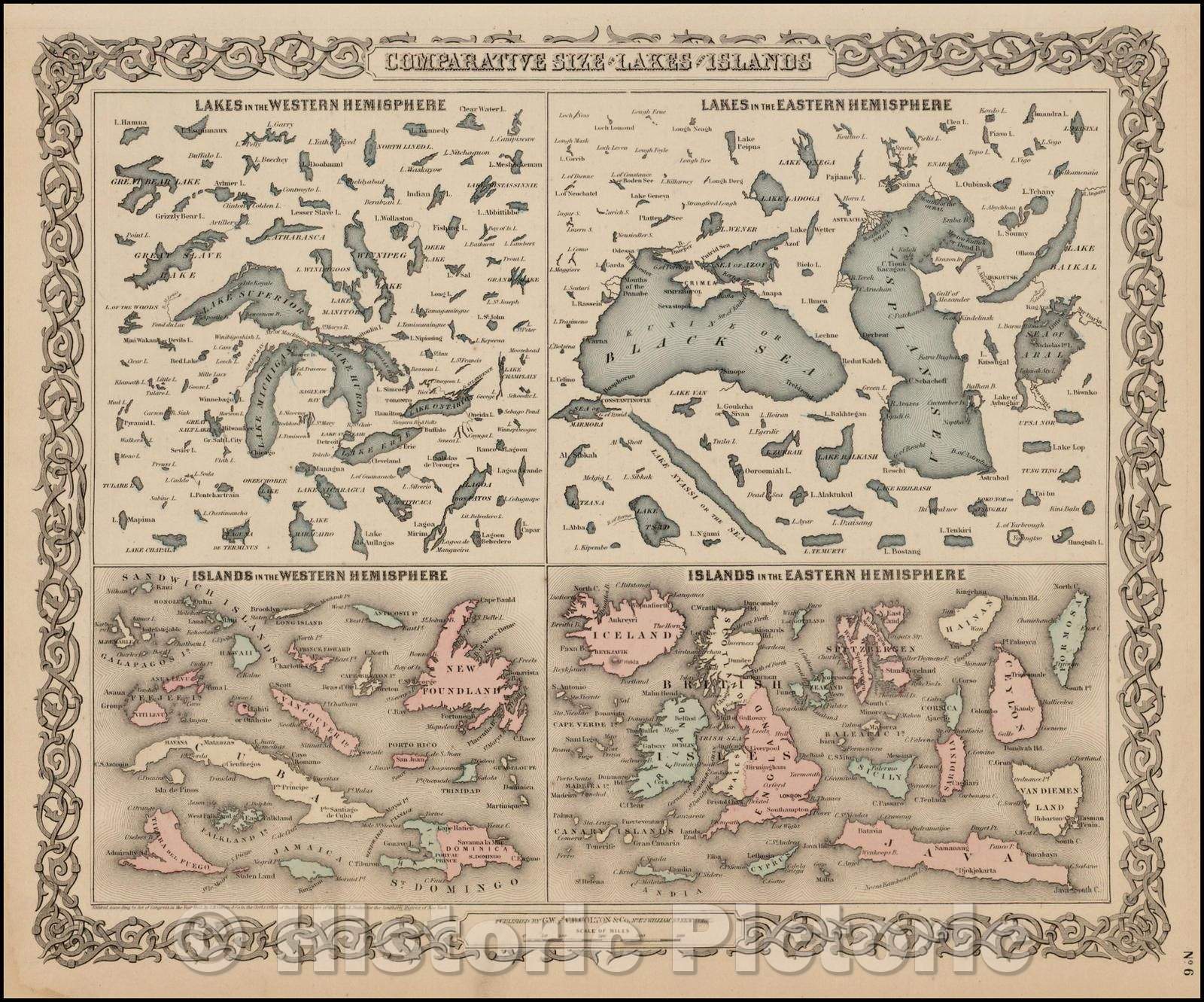 • Historic Map - Comparative Size of Lakes and Islands [Great Lakes, Cuba, Formosa, Ireland, Sicily, Cyprus, Vancouver, Sandwich Islands, Puerto Rico, Corsica, 1855 v2