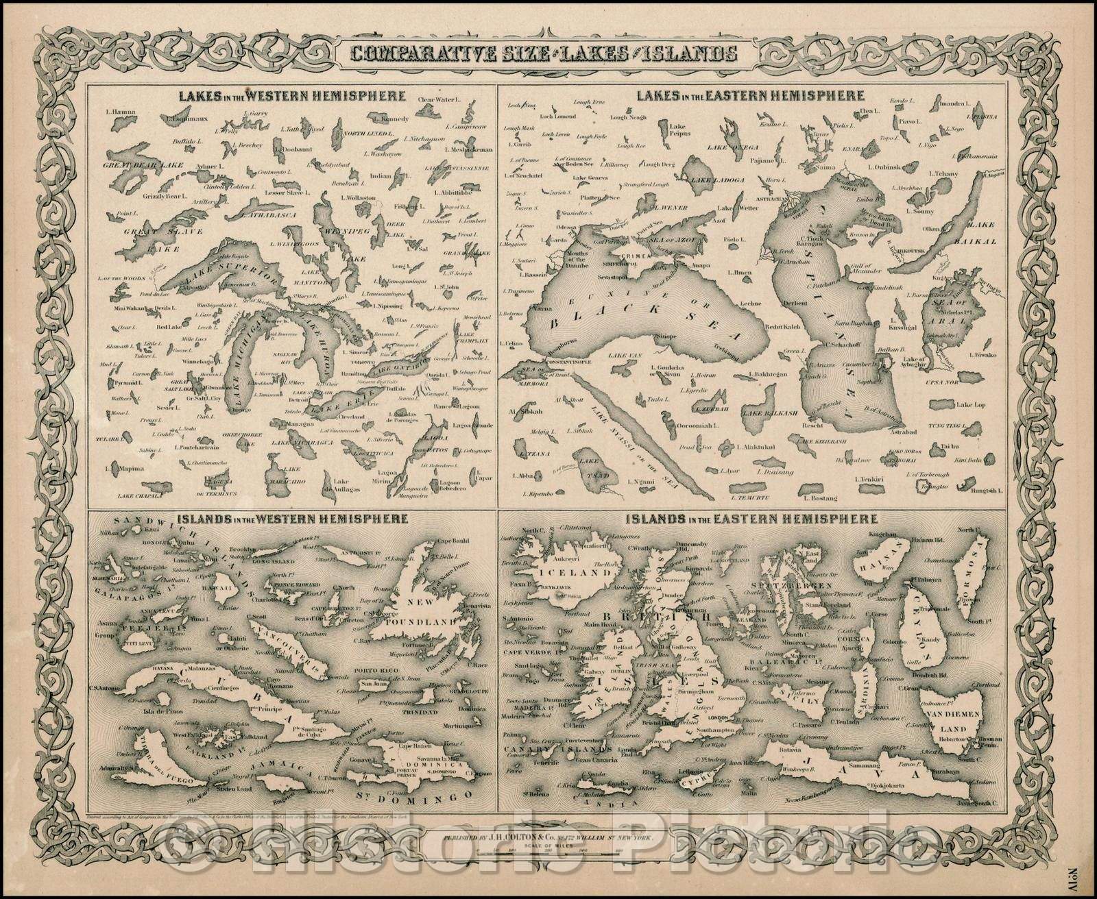 • .Historic Map - Comparative Size of Lakes and Islands [Great Lakes, Cuba, Formosa, Ireland, Sicily, Cyprus, Vancouver, Sandwich Islands, Puerto Rico, Corsica, 1855 v1
