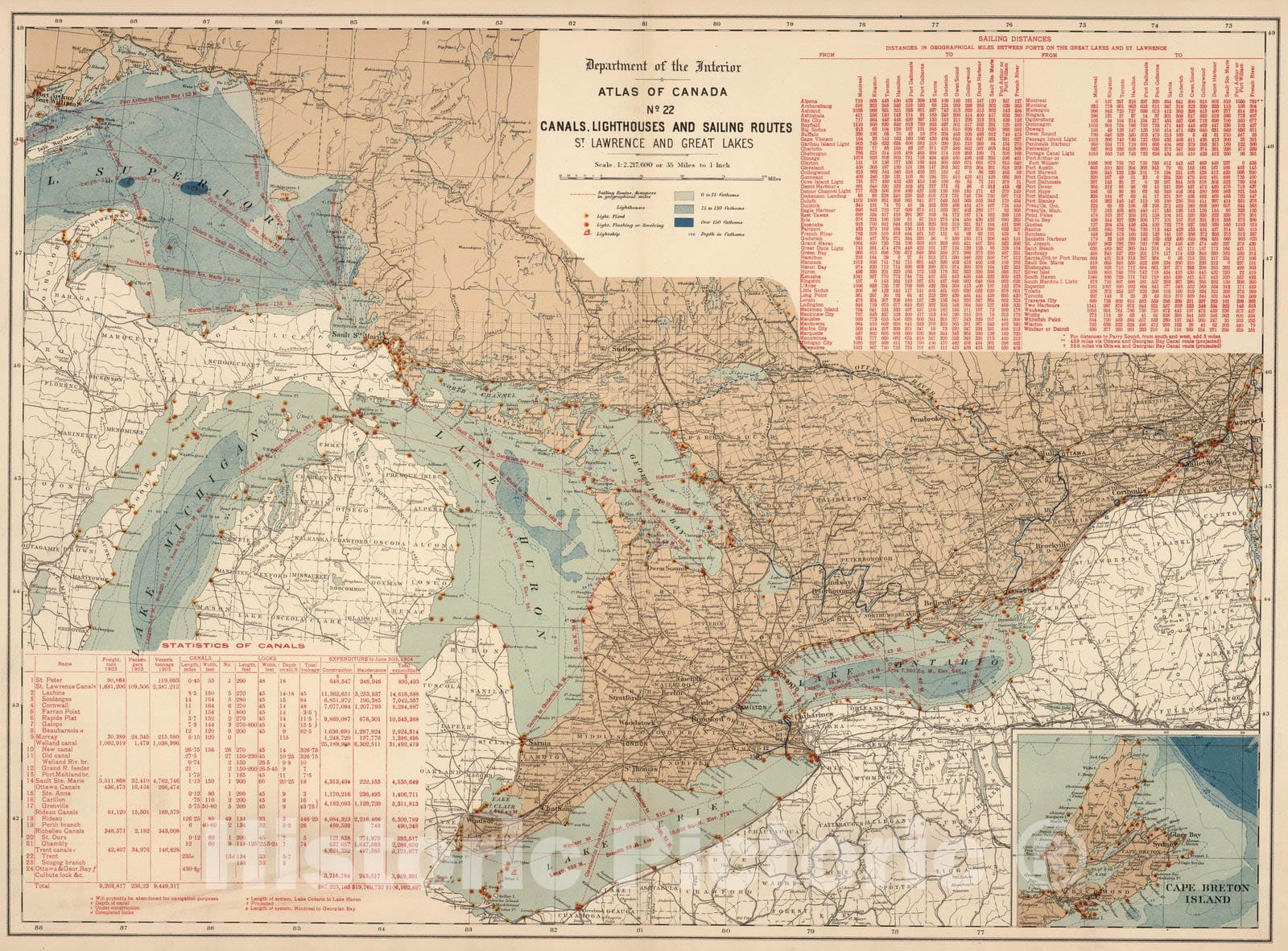 Department of Interior : Atlas of Canada, No. 22 : Canals, lighthouses and sailing routes : St. Lawrence and Great Lakes. (to accompany) Department of the Interior, Canada ... 1906. (inset) Cape Breton Island. | Department of the Interior, Canada. Honorable Frank Oliver, Minister, 1906. Atlas of Canada. Prepared under the direction of James White, F.R.G.S., Geographer. (on verso of title page) The Toronto Lithographing Company, Limited; Map engravers, and dedication note. | Full color, 21 p., 83 plates including maps and diagrams. The Atlas of Canada, first edition published by the Department of the Interior in 1906, was one of the world's first national atlases. A second edition similar in style and content was published in 1915, both editions, featuring thematic maps dealing with Canada's geology, communications, natural resources, population, economic activities, transportation, as well as maps of principal cities. During this period, a major part of Canada's growth was due to the great influx of immigrants into Canada, many of them coming to open up the farmlands of the Prairies. Consequently, the first two editions of the Atlas of Canada reflect a particular interest in transportation and communications and devote a significant amount of space to mapping the composition and density of the population. Bound in half leather brown covered boards with "Department of Interior 1906 Atlas of Canada." in gilt. Atlas is bound in half leather brown cloth covered boards with "Department Of The Interior. 1906. Atlas of Canada."