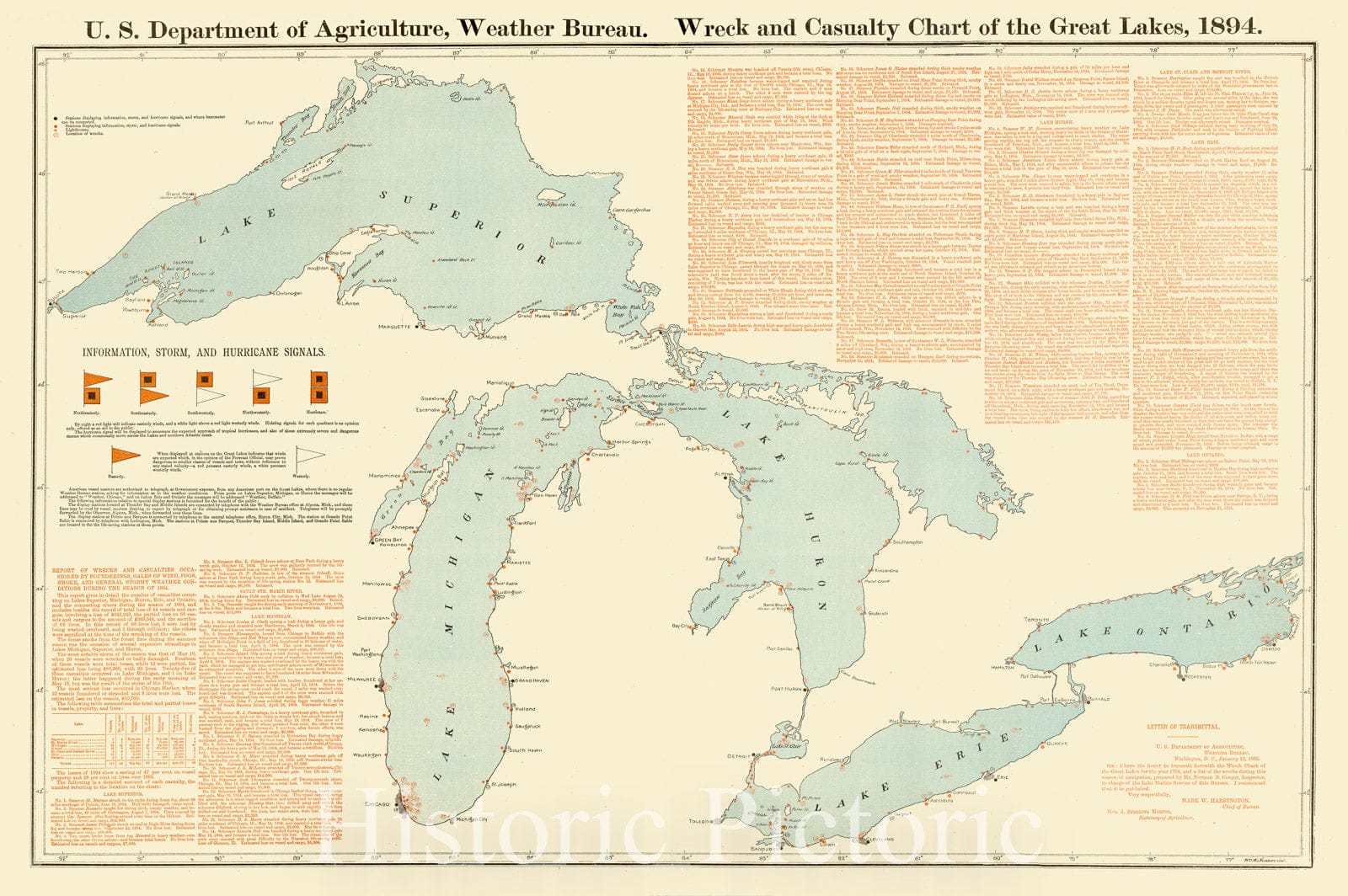 Map : Great Lakes 1894, Wreck and casualty chart of the Great Lakes, 1894 , Antique Vintage Reproduction