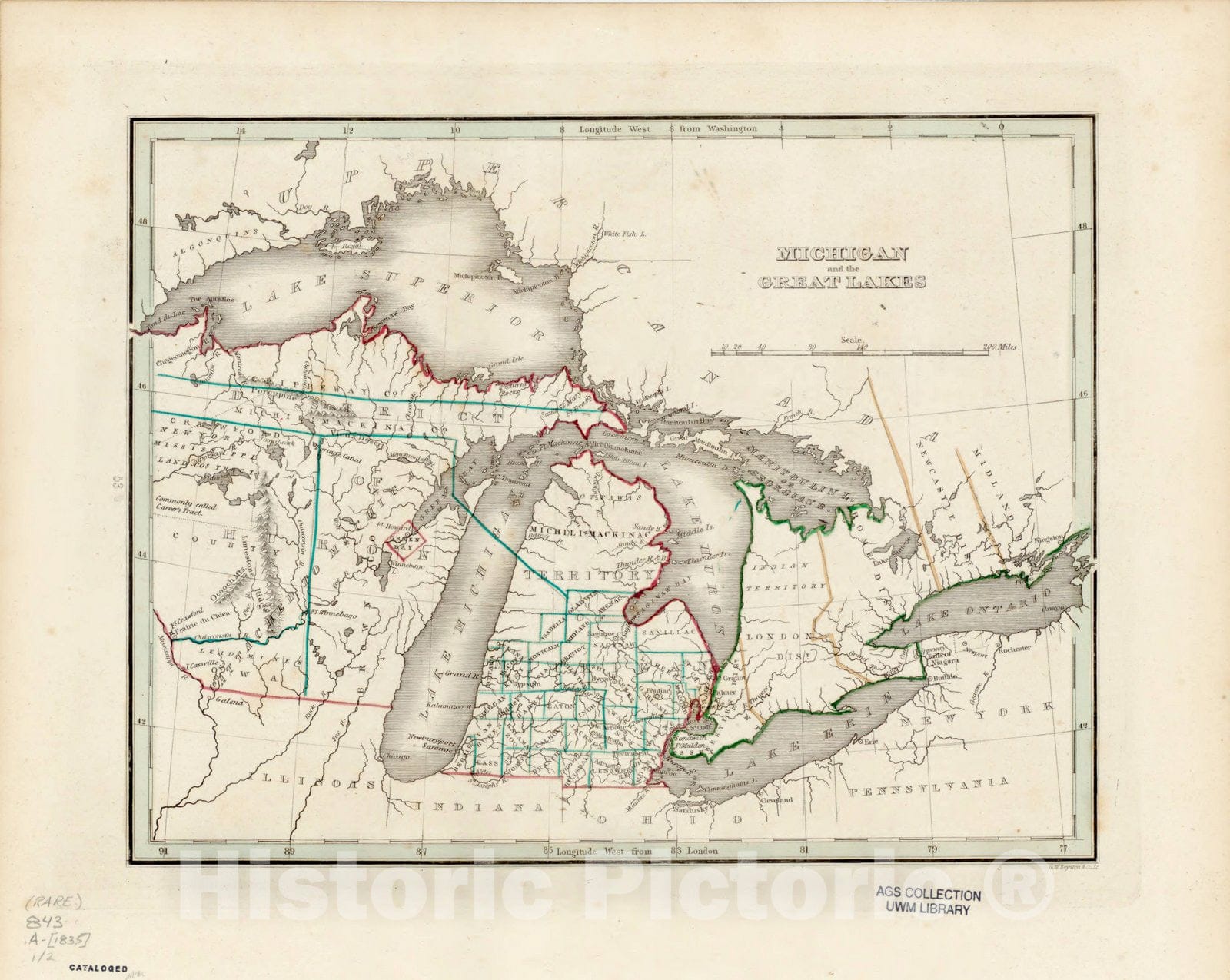 Map : Michigan and the Great Lakes 1835, Michigan and the Great Lakes , Antique Vintage Reproduction