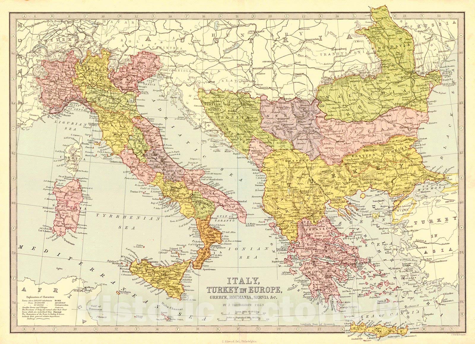 Vintage Map | 1870 Italy, Turkey in Europe, Greece, Roumania, Servia | Bartholomew, John