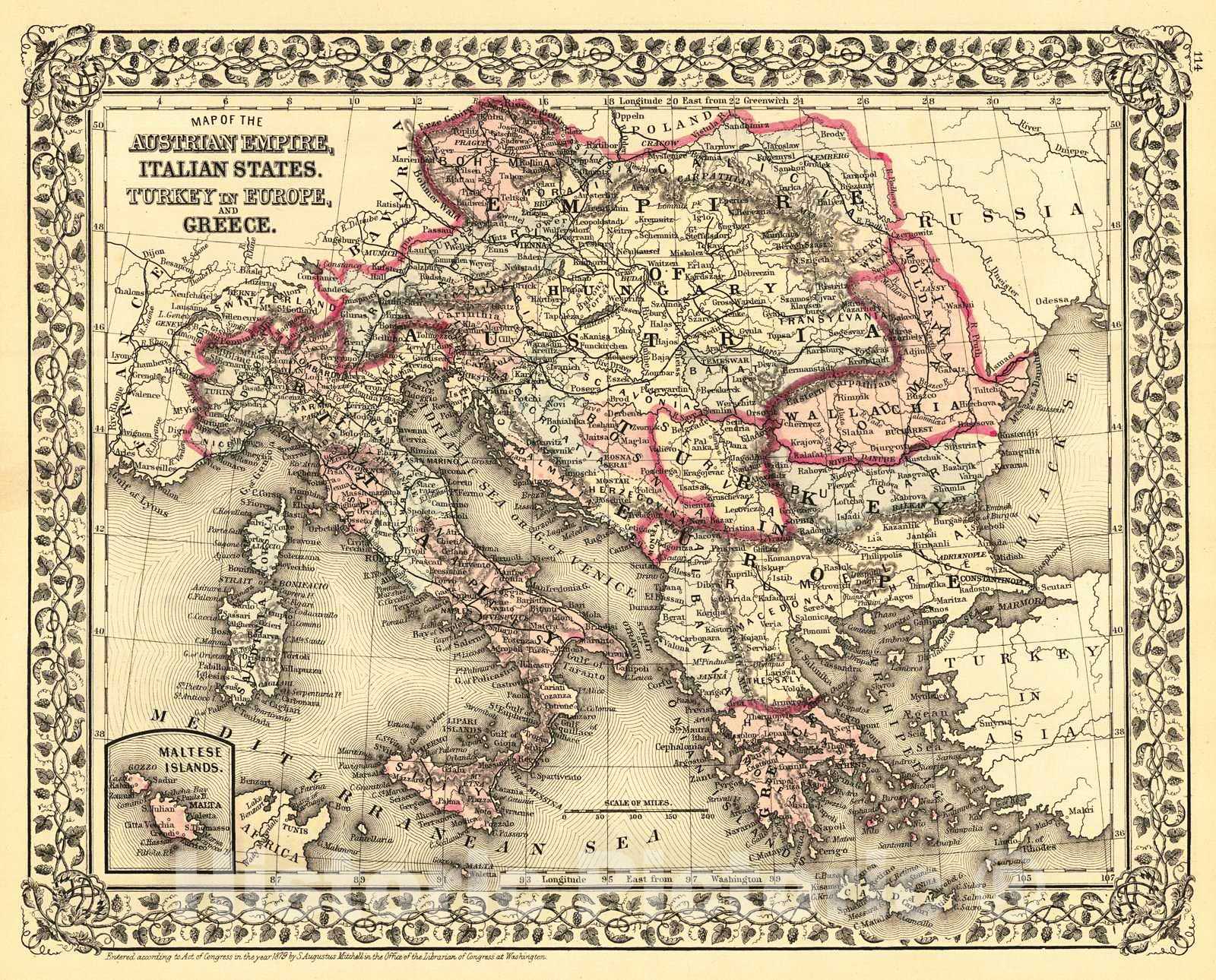 • .Historic Map : 1880 Map of the Austrian Empire, Italian States, Turkey in Europe and Greece : Vintage Wall Art