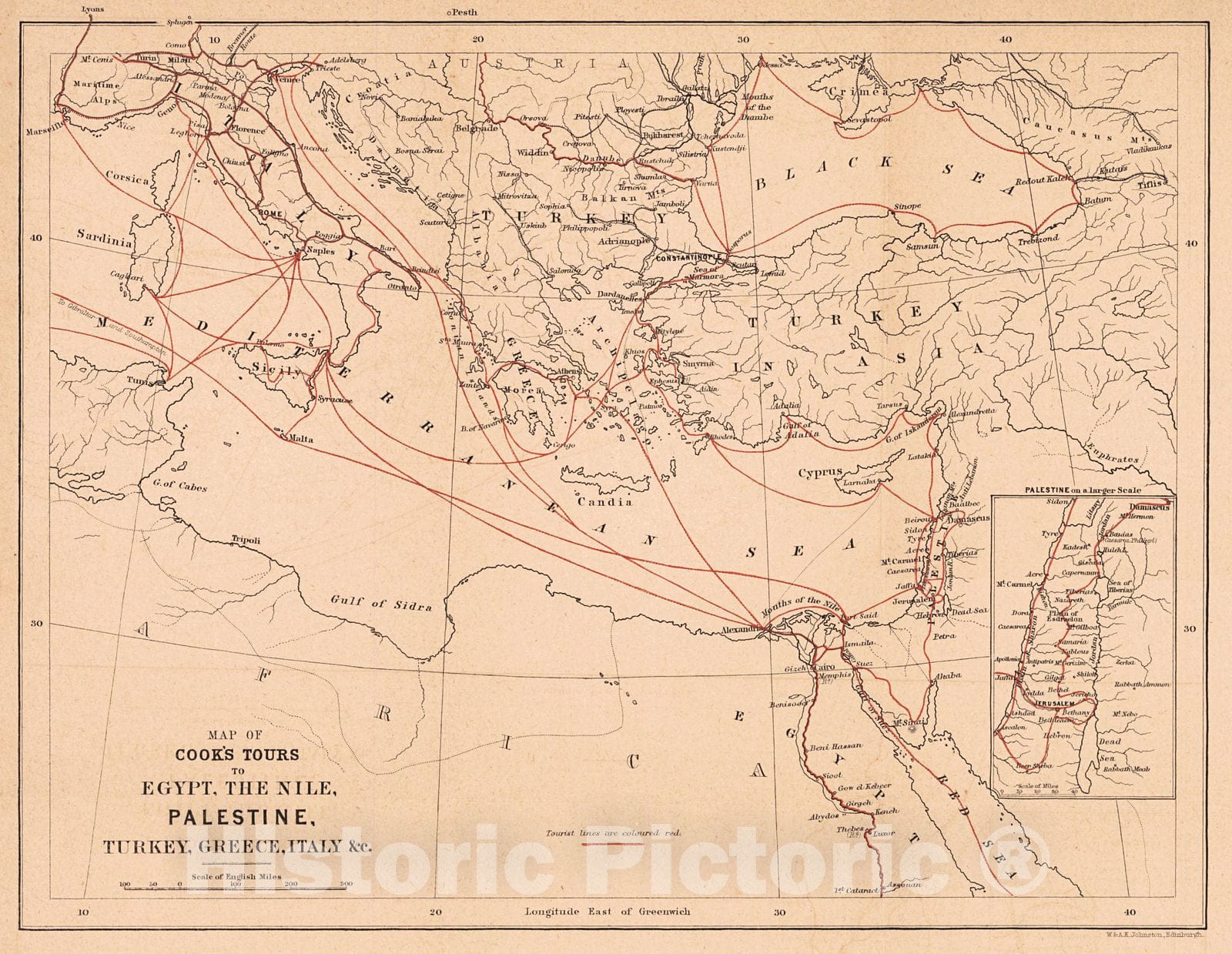 Vintage Map | 1881 Map of Cook's Tours to Egypt, The Nile, Palestine, Turkey, Greece, Italy | Johnston, William and Alexander Keith