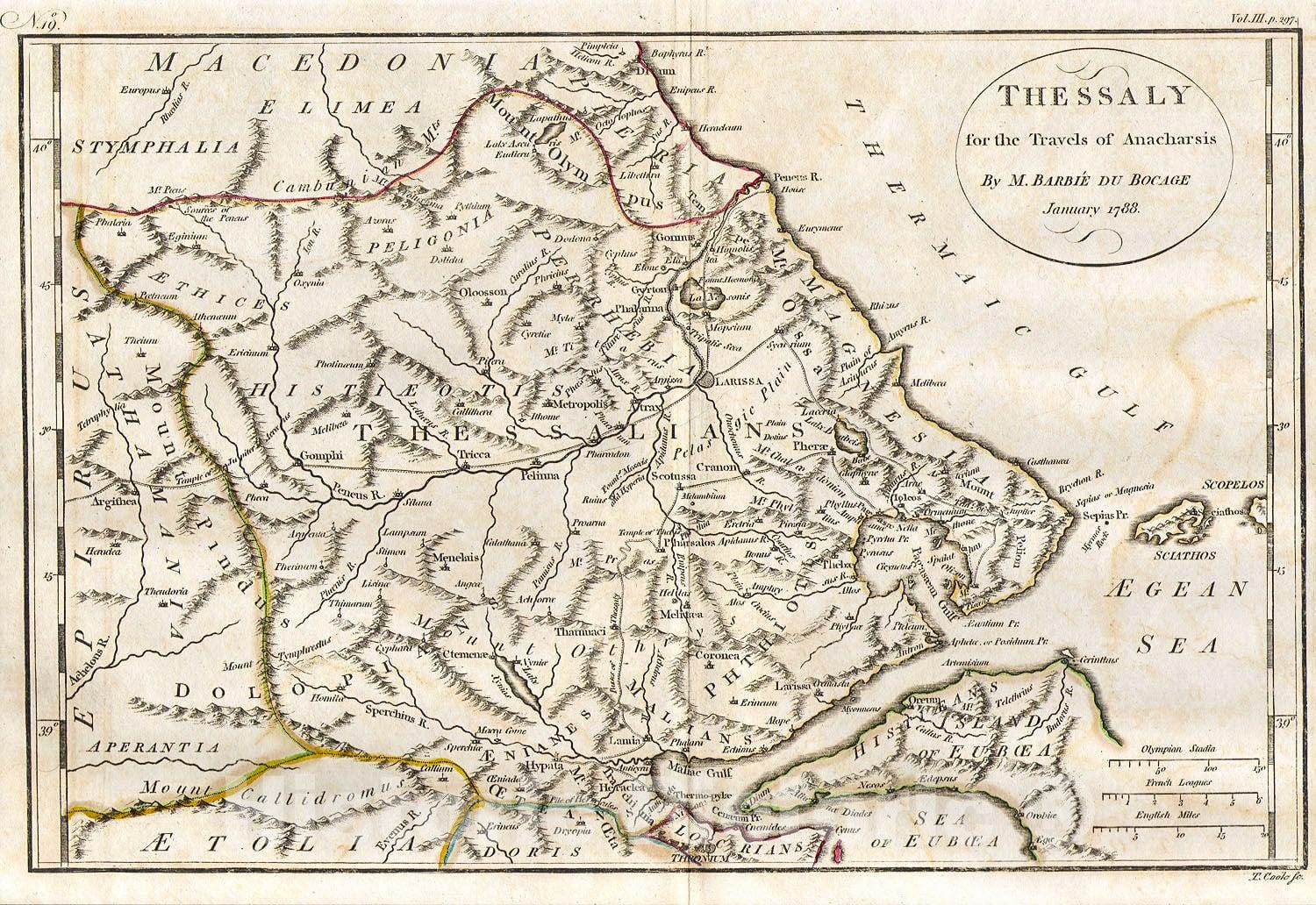 This lovely little map of Thessaly, just south of Macedonia in Ancient Greece, was prepared by M. Barbie de Bocage in 1786 for the "Travels of Anarcharsis". Taken from the early D'Anville map. Thessaly is the legendary seat of Phthiotis, home of Achilles and his Myrmidons, who were so prominently featured in the Illiad. Achilles's father King Peleus, ruled this region. There is also a curious theory that the people of Thessaly were blond, drawn from Homer's reference to Achillies.