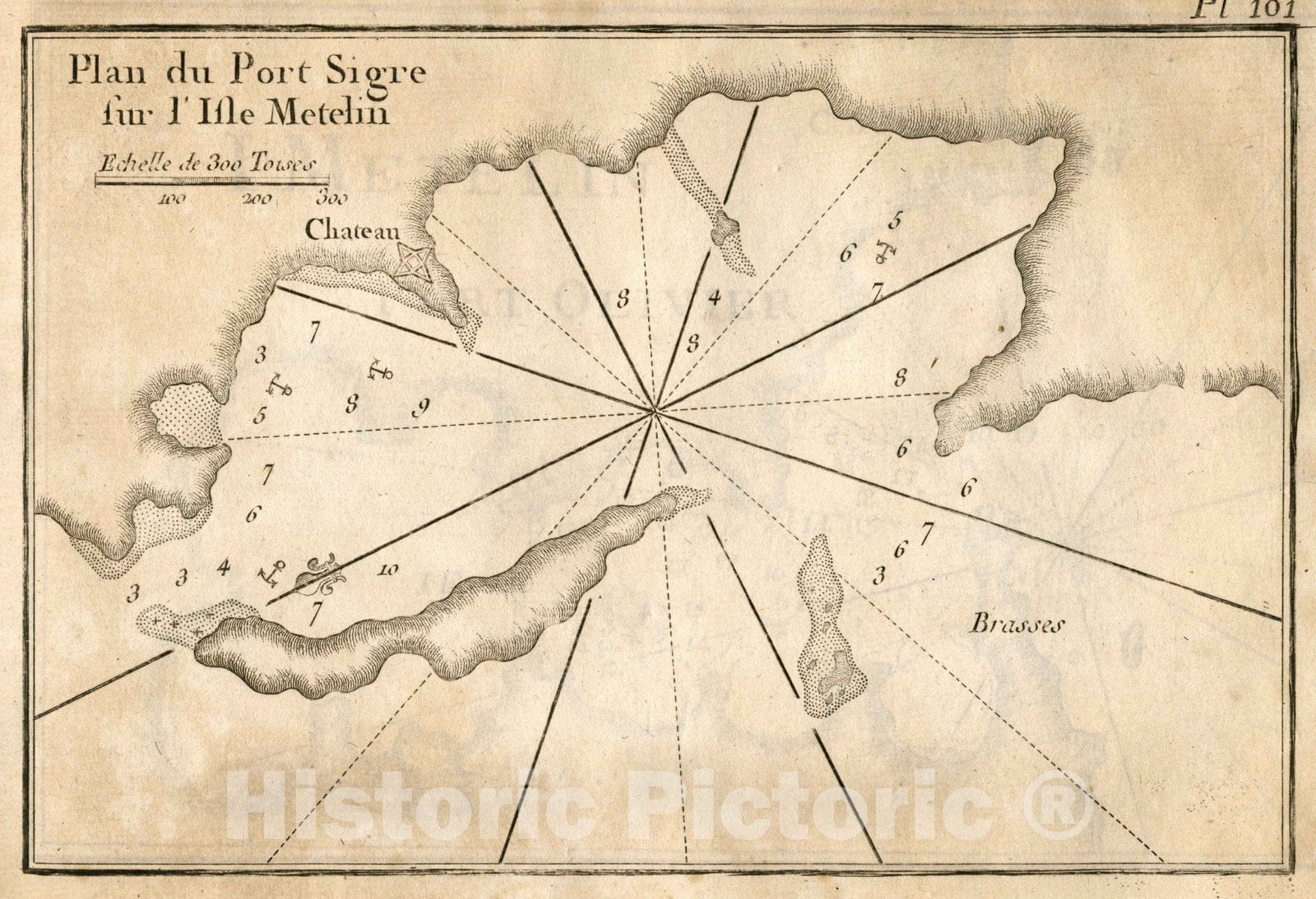 Pl. 101. Plan du Port Sigre sur l'Isle Metelin (Map of the Port of Sigre on the Isle of Metelin). | Receuil Des Principaux Plans des Ports, et Rades de la Mer Mediterranee, Estraits, de ma Carte de Douze Feiiilles. Dediee a Monsgr. le Duc de Choiseul, Ministre de la guerre et de la Marine gravee avec Privilege du Roy. Par Son tres humble Serviteur, Joseph Roux, Hidrographe du Roy. A Marseille, 1764. (Compilation of the Plans of the Principal Ports and Natural Harbors of the Mediterranean, Straits. Map in Twelve Sheets. Dedicated to Monsieur the Duke de Choiseul, Minister of War and Navy engraved with the Privilege of the King. By His very humble servant, Joseph Roux, Hydrographer to the King. In Marseille, 1764). | A small format atlas with one port per page. In French. Most editions of this atlas have fewer than the 170 charts of ports found in this copy.