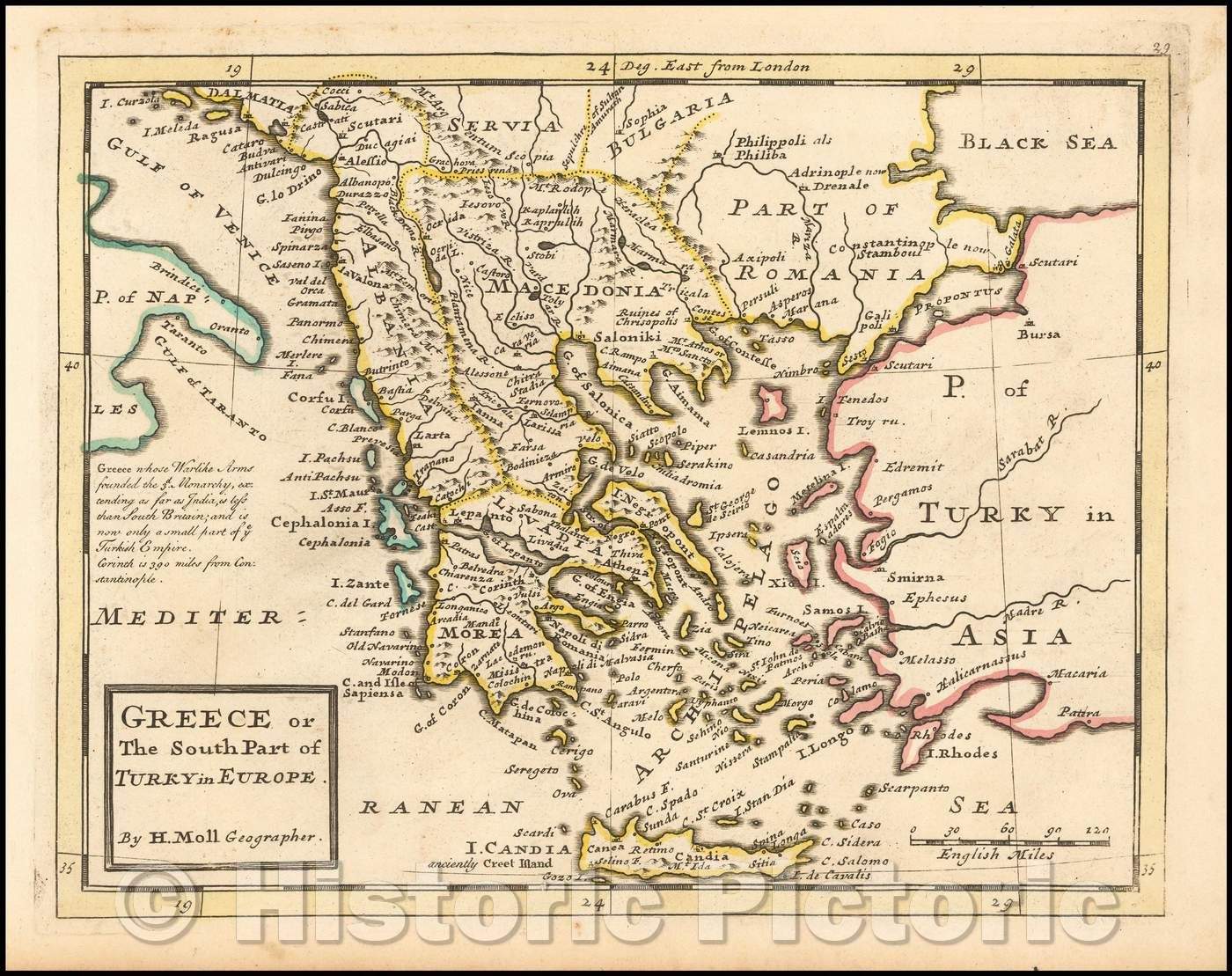 • .Historic Map - Greece or The South Part of Turky in Europe, 1729, Herman Moll - Vintage Wall Art