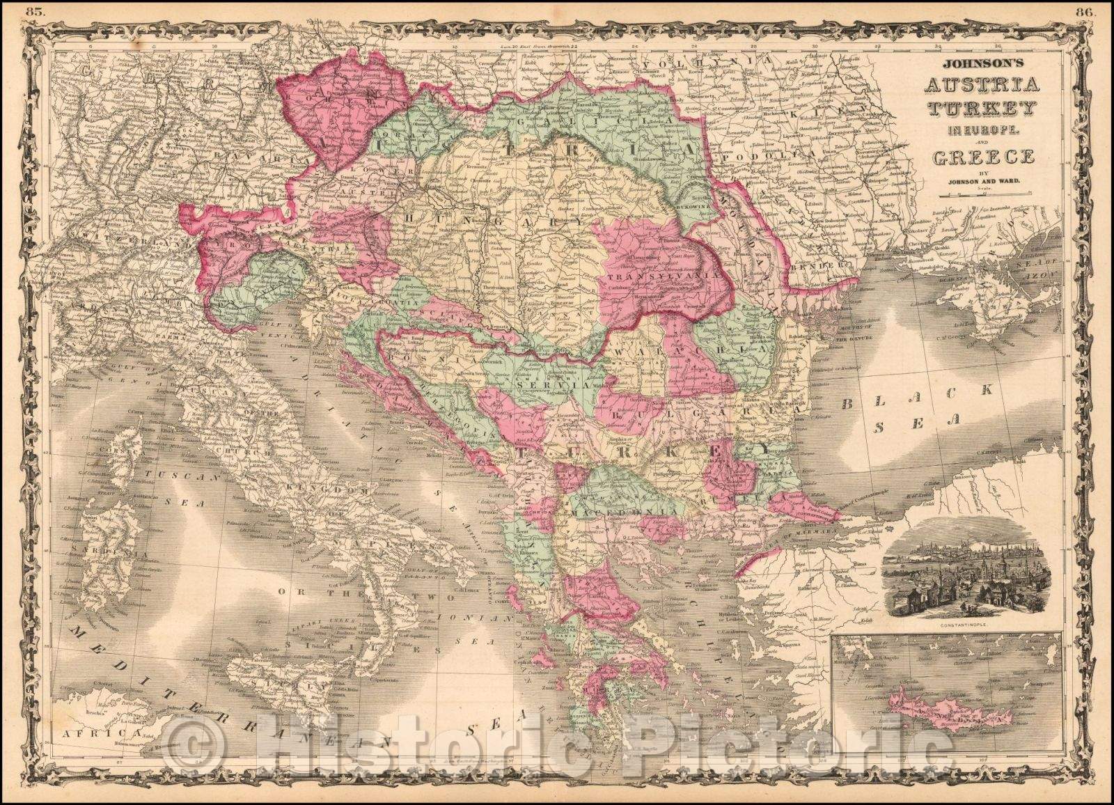Historic Map - Johnson's Austria Turkey in Europe and Greece, 1866, Benjamin P Ward - Vintage Wall Art