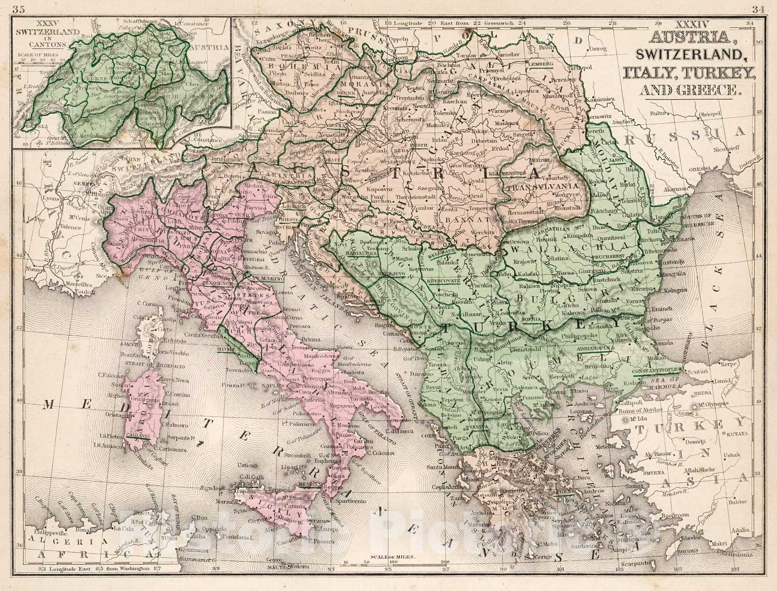 Historic Map : Map No. XXXIV. Austria, Switzerland, Italy, Turkey, Greece. XXXV. Switzerland in Cantons, 1865, Vintage Wall Decor