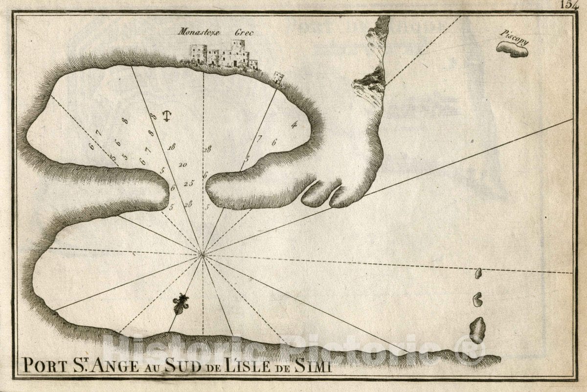Pl. 154. Port St. Ange au Sud de L'isle de Simi (Port Saint Ange South of the Island of Symi). | Receuil Des Principaux Plans des Ports, et Rades de la Mer Mediterranee, Estraits, de ma Carte de Douze Feiiilles. Dediee a Monsgr. le Duc de Choiseul, Ministre de la guerre et de la Marine gravee avec Privilege du Roy. Par Son tres humble Serviteur, Joseph Roux, Hidrographe du Roy. A Marseille, 1764. (Compilation of the Plans of the Principal Ports and Natural Harbors of the Mediterranean, Straits. Map in Twelve Sheets. Dedicated to Monsieur the Duke de Choiseul, Minister of War and Navy engraved with the Privilege of the King. By His very humble servant, Joseph Roux, Hydrographer to the King. In Marseille, 1764). | Publisher:Joseph Roux