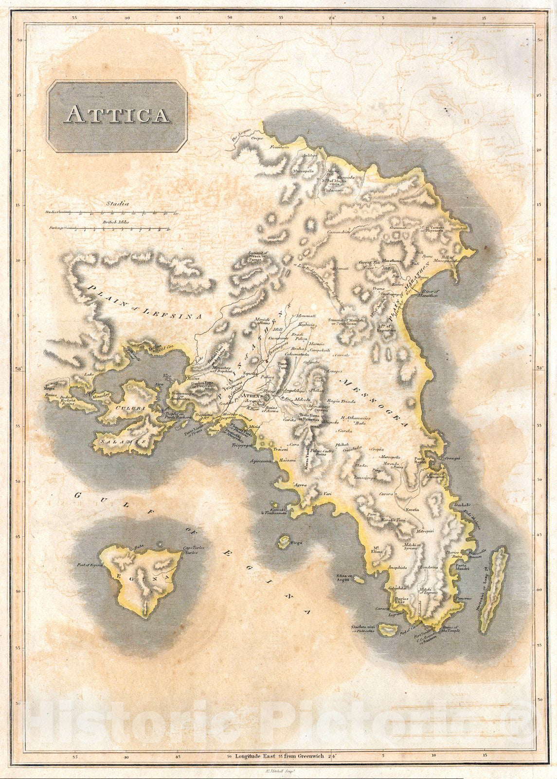 This is an attractive 1814 John Thomson map of Attica, Greece. Map features many of the important cities and site in early Greek History. Shows Athens, the Plain of Marathon, Salamis, and the sites of numerous historic ruins. Extends as far west as Megra and as far north as the Ascopus River. Engraved by E. Mitchell for Thomson's General Atlas.