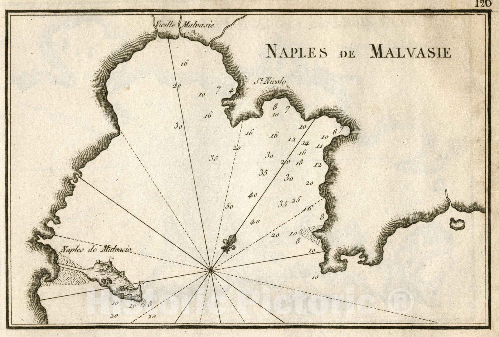 Pl. 126. Naples de Malvasie (Monemvasia). | Receuil Des Principaux Plans des Ports, et Rades de la Mer Mediterranee, Estraits, de ma Carte de Douze Feiiilles. Dediee a Monsgr. le Duc de Choiseul, Ministre de la guerre et de la Marine gravee avec Privilege du Roy. Par Son tres humble Serviteur, Joseph Roux, Hidrographe du Roy. A Marseille, 1764. (Compilation of the Plans of the Principal Ports and Natural Harbors of the Mediterranean, Straits. Map in Twelve Sheets. Dedicated to Monsieur the Duke de Choiseul, Minister of War and Navy engraved with the Privilege of the King. By His very humble servant, Joseph Roux, Hydrographer to the King. In Marseille, 1764). | A small format atlas with one port per page. In French. Most editions of this atlas have fewer than the 170 charts of ports found in this copy.