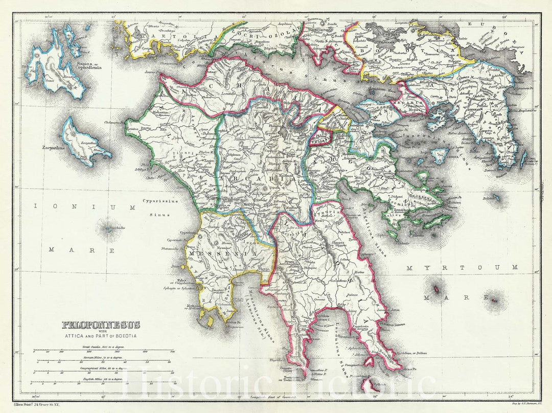 Historic Map : Hughes Map of The Peloponnese Peninsula or Southern Greece in Antiquity, 1867, Vintage Wall Art