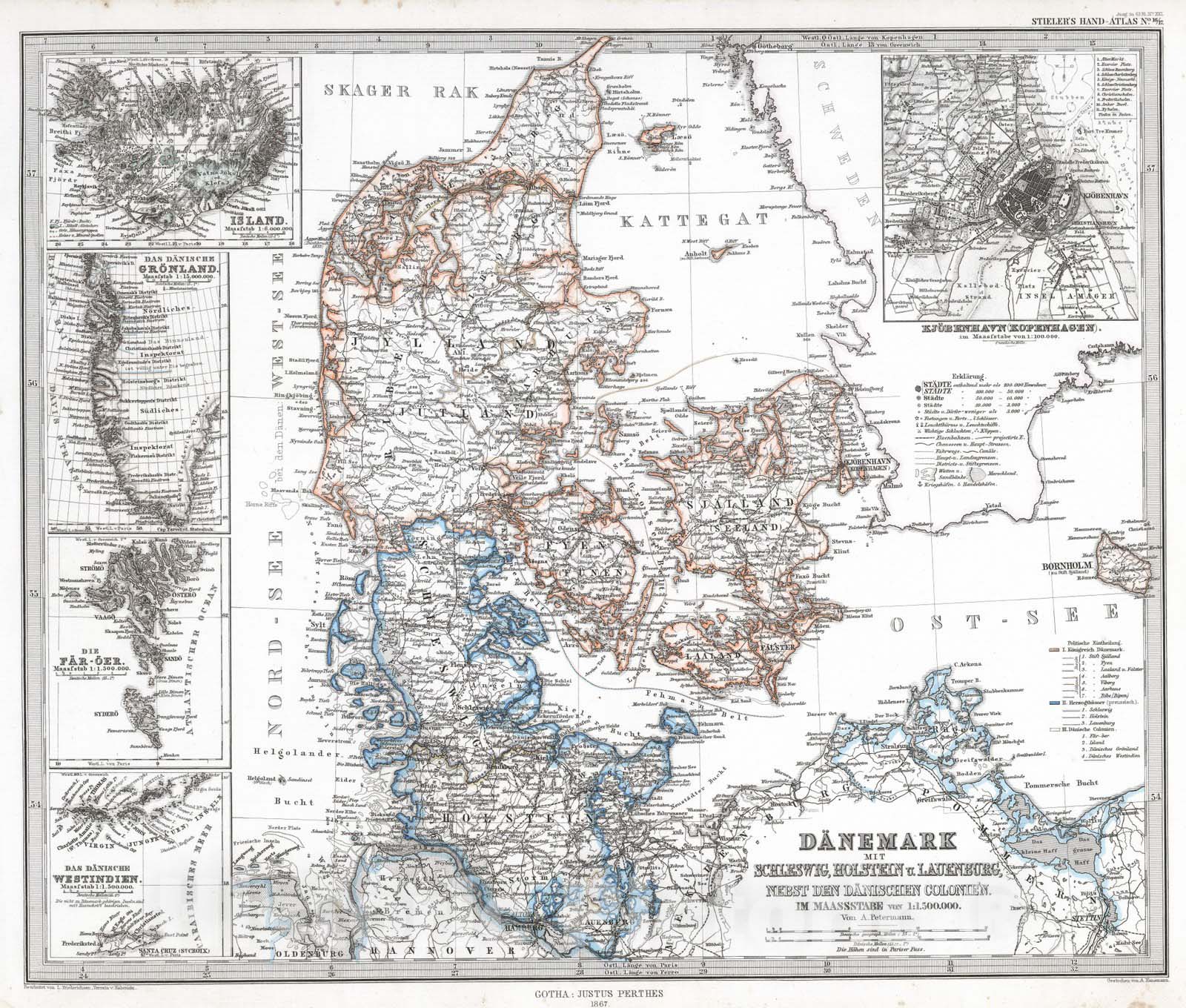 Historic Map : Denmark; Iceland, 1867 Danemark mit Schleswig, Holstein, und Laeenburg. (Sweden, Norway, Denmark, Faroe Island, Greenland). , Vintage Wall Art