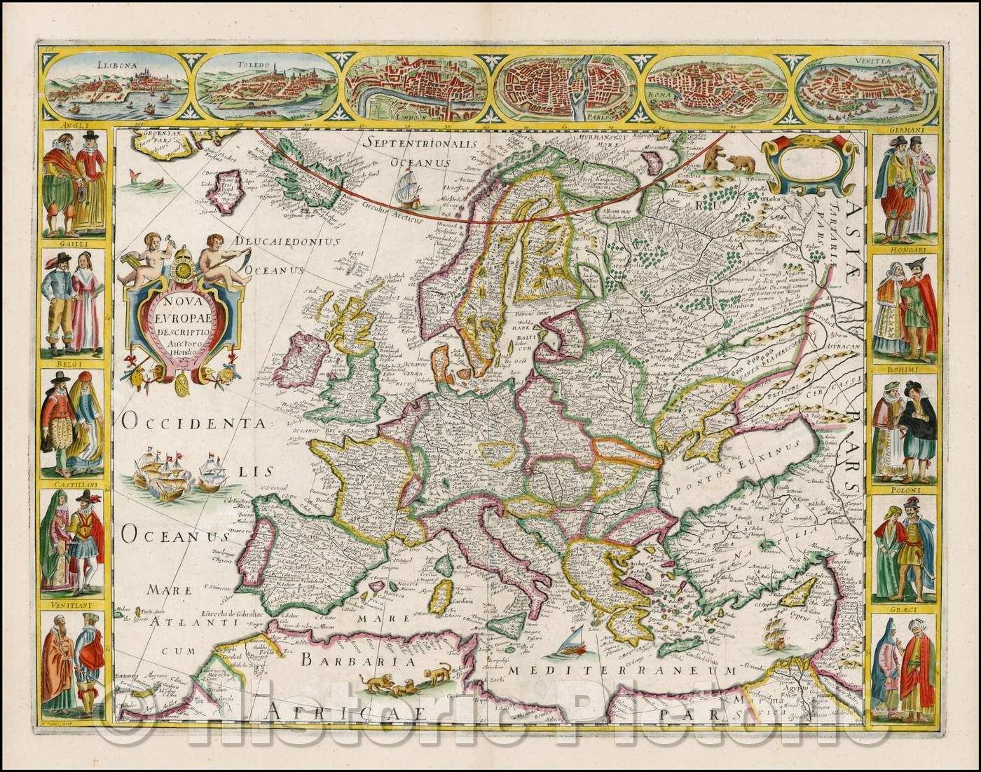 Historic Map - Nova Europae Descriptio [Carte-a-figures] / Map of Europe, massive Greenland, Iceland and the mythical island of Frislandt, 1650, Jodocus Hondius - Vintage Wall Art