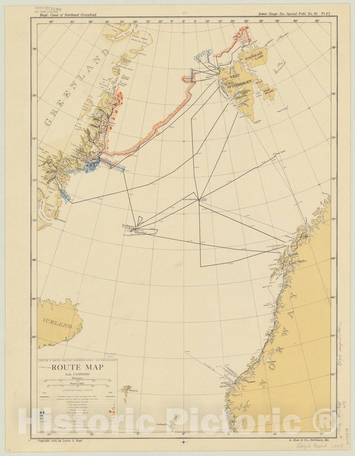 Louise A. Boyd Arctic expeditions - S.S. Veslekari route map / compiled by J.M. LeRoy, Hydographer and F.W. Buhler, Surveyor and drawn at the American Geographical Society of New York, 1941 ; A. Hoen & Co.