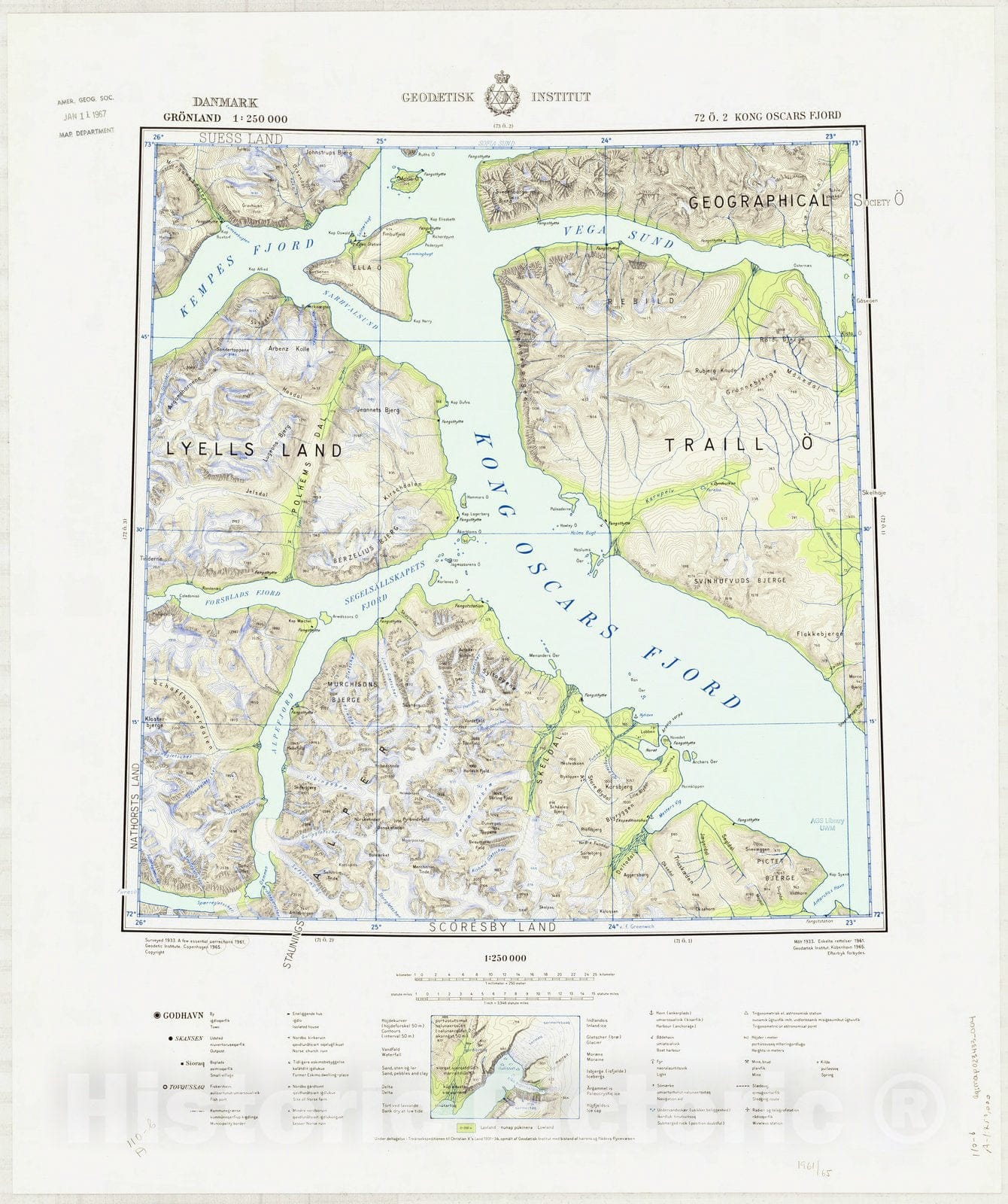 Map : Kong Oscars Fjord, Greenland 1965, Danmark, Gronland 1:250 000 Kong Oscars Fjord, Antique Vintage Reproduction