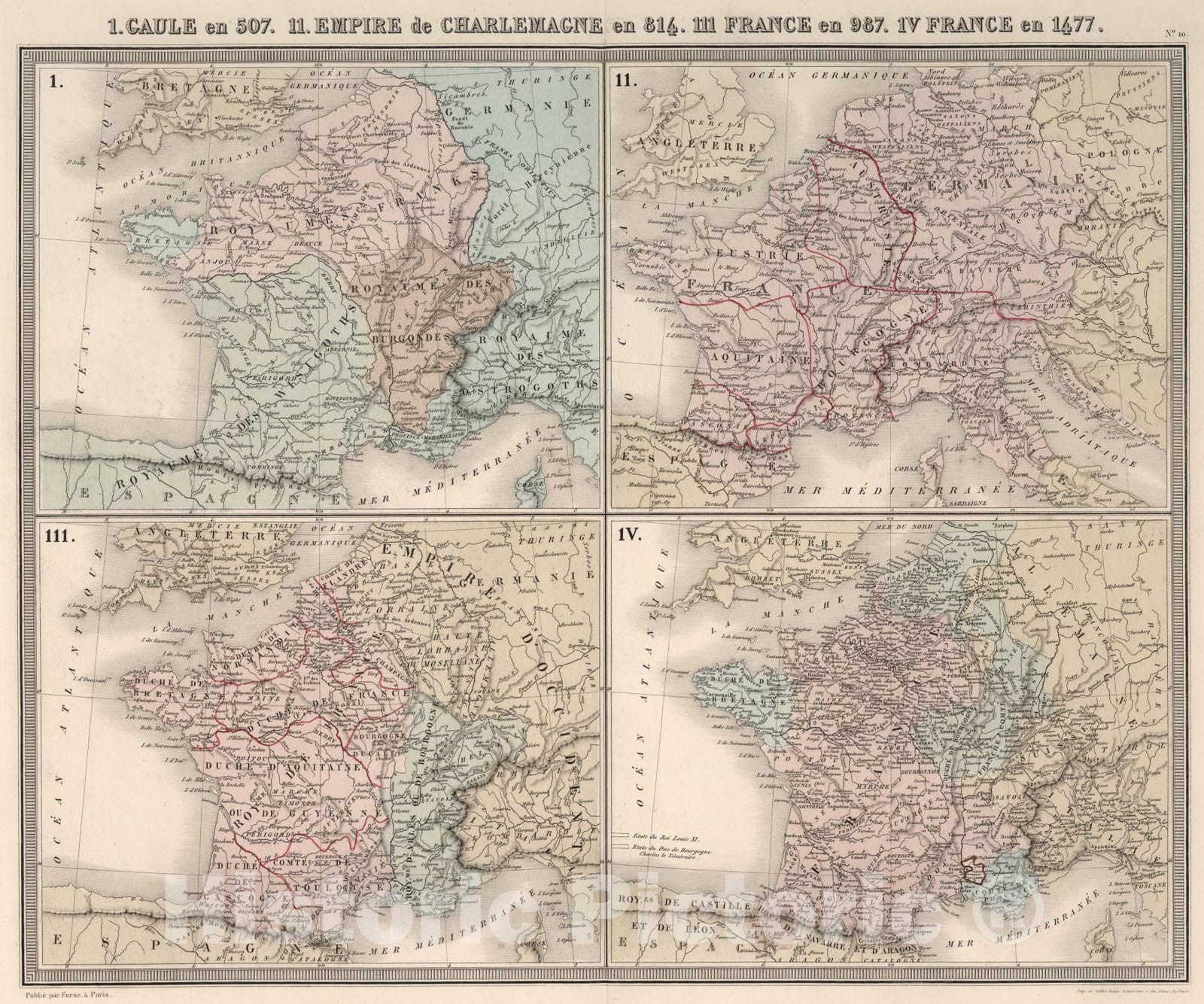 • .Historic Map : I. Gaule en 507. II. Empire de Charlemagne en 814. III. France en 987. IV. France en 1677., 1863, Vintage Wall Art