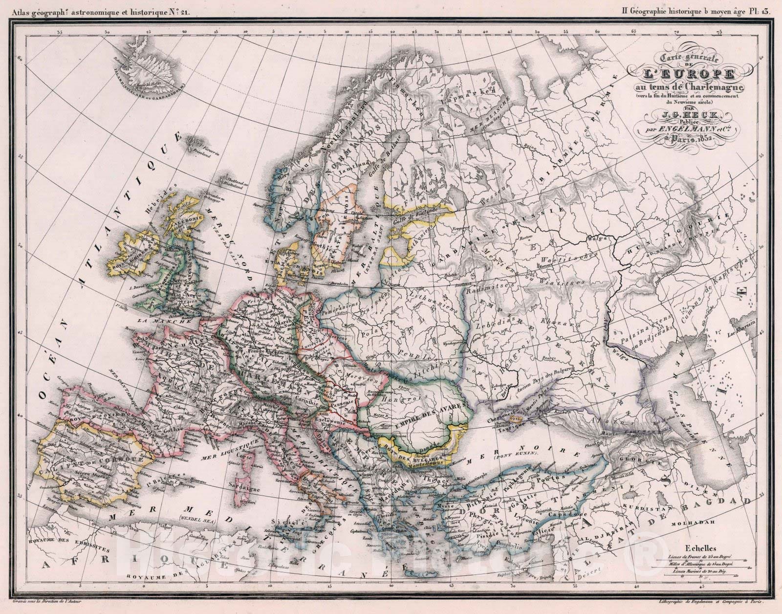 Historic Map : World Atlas Map, 21. Carte generale de l'Europe au tems de Charlemange. 1832 - Vintage Wall Art