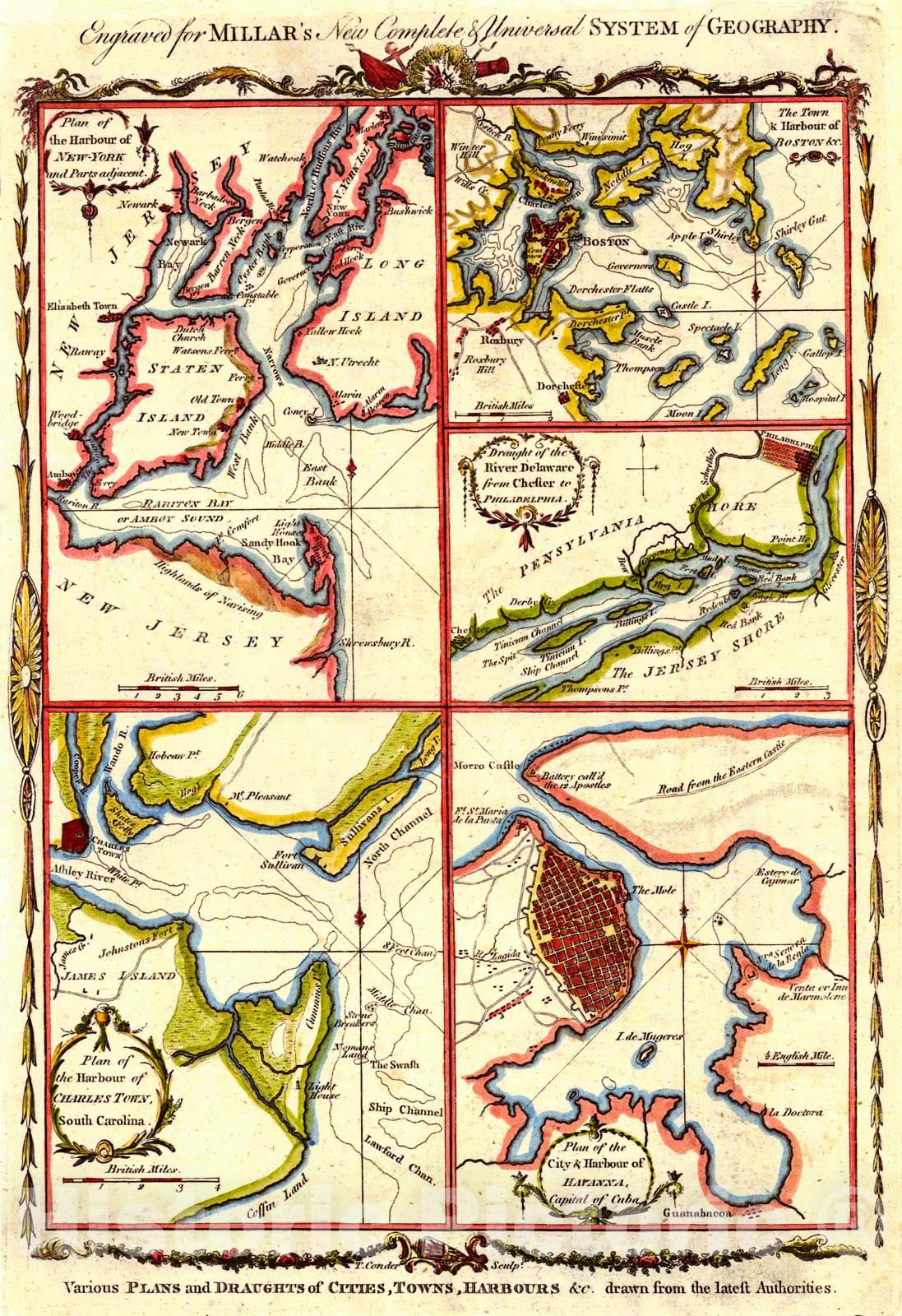 Vintage Map | 1782 Various Plans and Draughts of Cities, Towns, Harbors [New York, Boston, Charleston, Philadelphia, and Havana] | Conder, Thomas