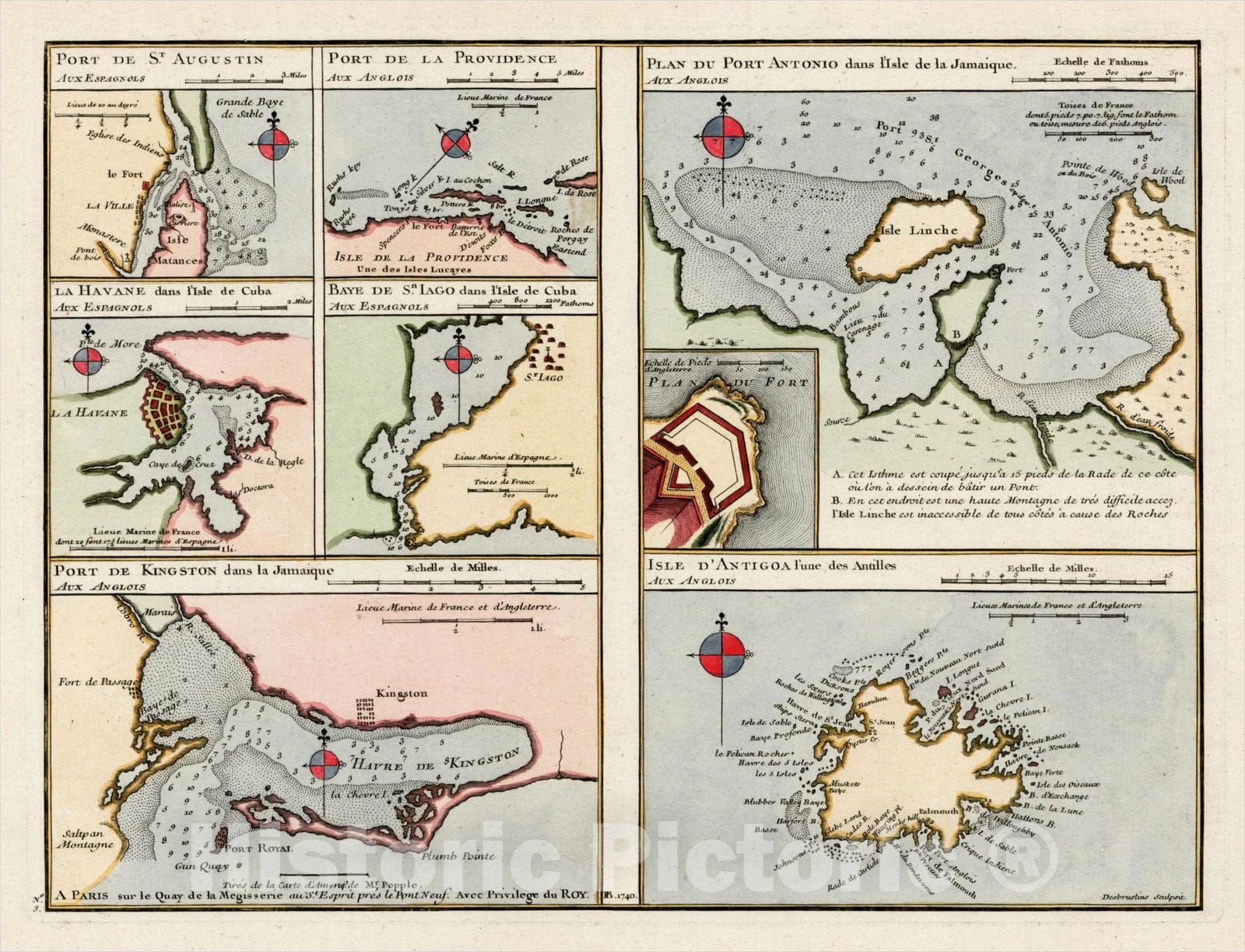 Historic Map : Harbors, Towns & Fortresses of St. Augustine, Grand Bahama Island, Jamaica, Havana, Santiago (Cuba), Kingston, and Antiqua, 1740, , Vintage Wall Art