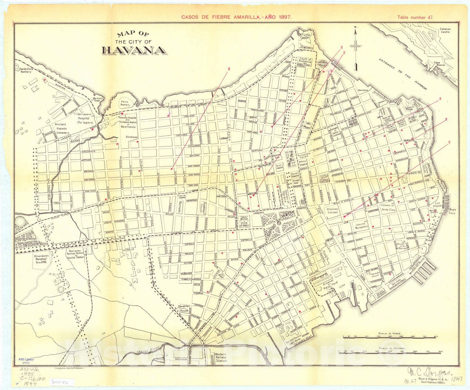 Map : Havana, Cuba 1897, Map of the city of Havana : Casos de fiebre amarilla, ano 1897 , Antique Vintage Reproduction