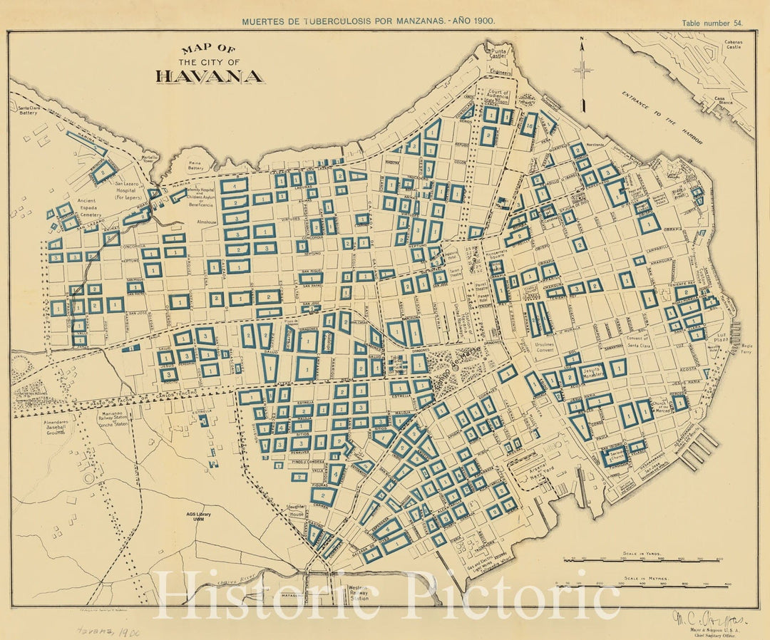 Map : Havana, Cuba 1900, Map of the city of Havana : muertes de tuberculosis por manzanas ano 1900 , Antique Vintage Reproduction