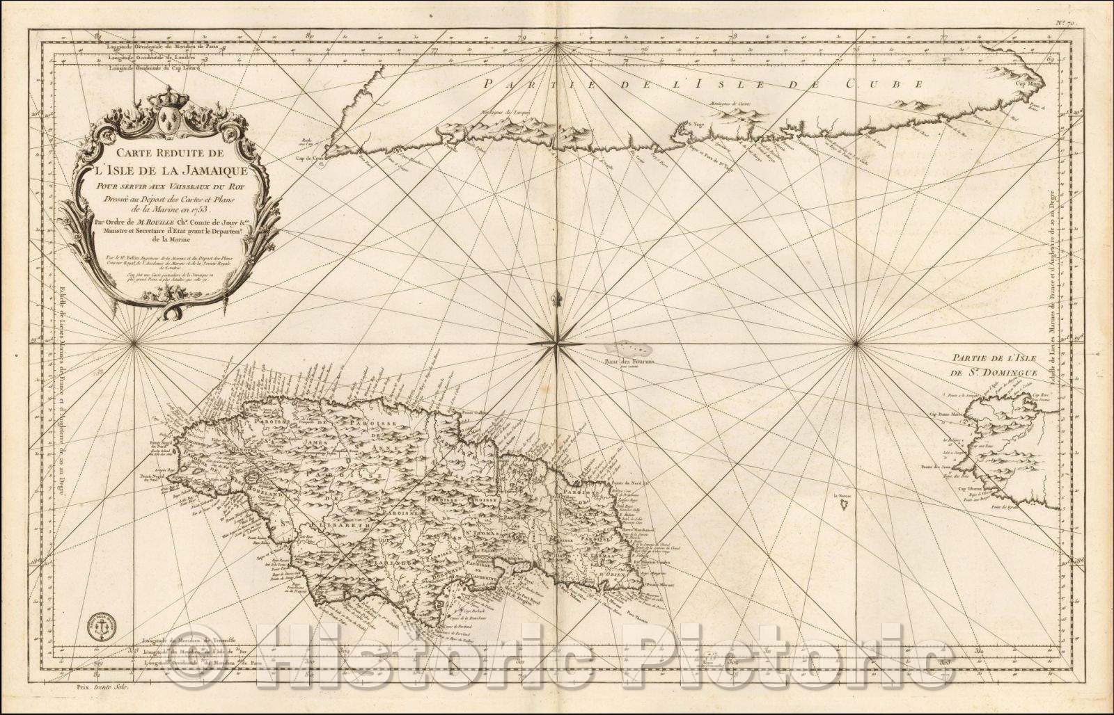 Historic Map - Carte Reduite De L'Isle De La Jamaique pour servir aux Vaisseaux Fra :: Sea Chart of the Region on Jamaica,southern Cuba and western Hispaniola, 1753 - Vintage Wall Art