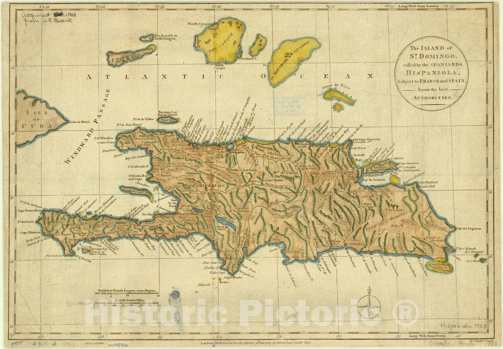 • .Historic Map : Hispaniola 1783 1, The Island of St. Domingo, called by the Spaniards Hispaniola subject to France and Spain from the best authorities , Antique Vintage Reproduction