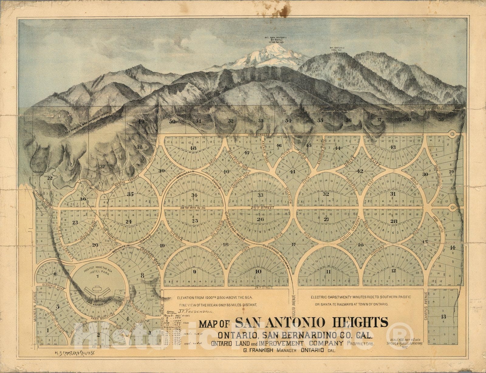 Map of San Antonio Heights, Ontario, San Bernadino Co. Cal. Ontario Land and Improvement Company, Proprietors. G. Frankish, Manager, Ontario, Cal. H.S. Crocker & Co., Lith. S.F. | Map of San Antonio Heights, Ontario, San Bernadino Co. Cal. Ontario Land and Improvement Company, Proprietors. G. Frankish, Manager, Ontario, Cal. H.S. Crocker & Co., Lith. S.F. | See Note field.