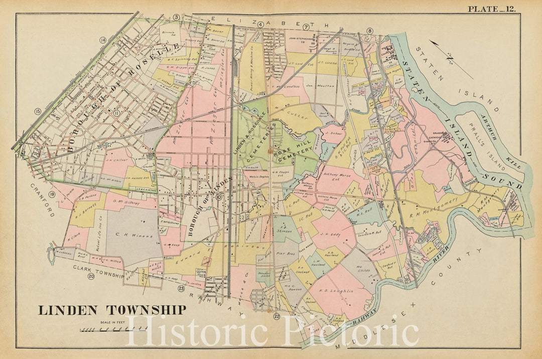 Historic Map - 1906 Union County, New Jersey (N.J.), 1906 Double Page Plate No. 12 [Map Of Linden Township] - Vintage Wall Art
