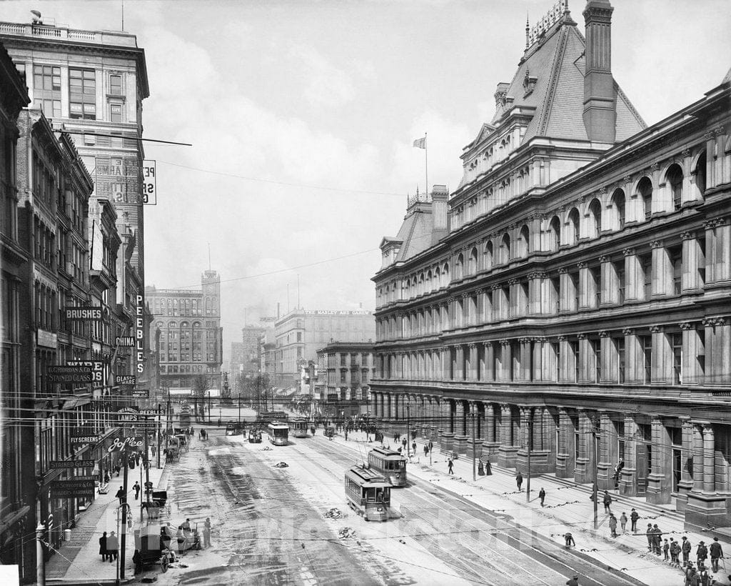 Looking west on Fifth Street from Main at the turn of the 20th century, one would gaze upon the U.S. Custom House and Post Office towering over Government Square. Built in the French Renaissance style in 1885, the building also served as a meeting plac