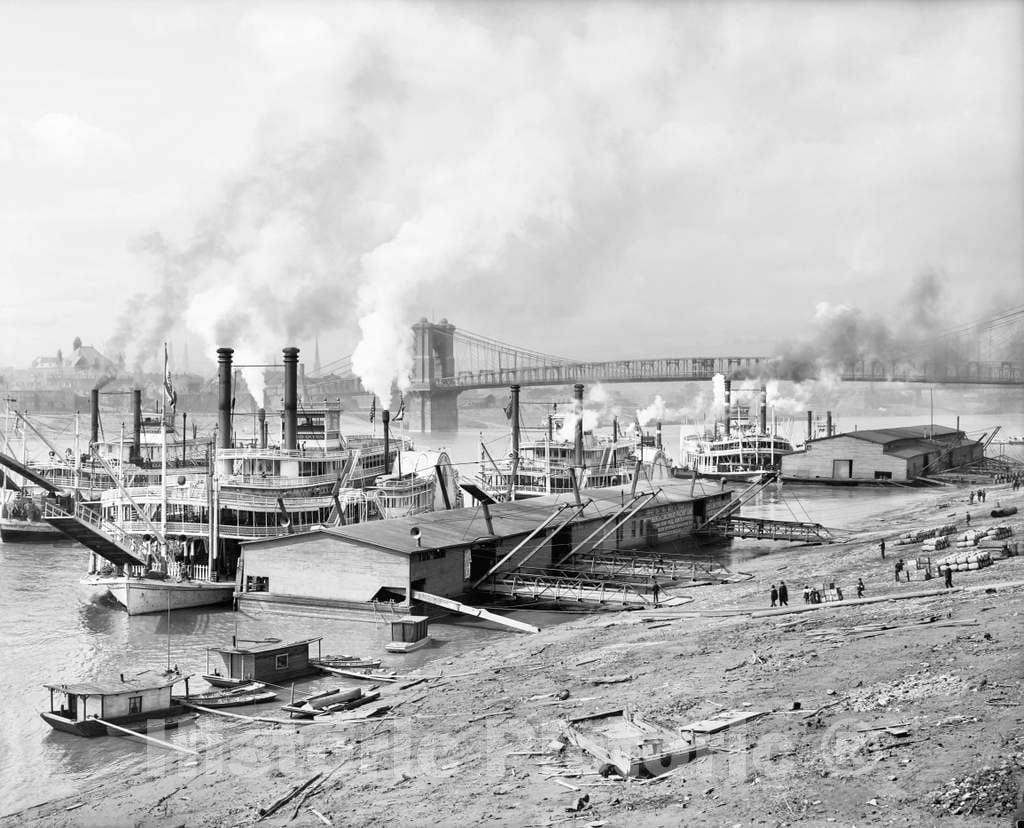 • .Historic Black & White Photo - Cincinnati, Ohio - Steamboat Traffic on the Ohio River, c1907 -