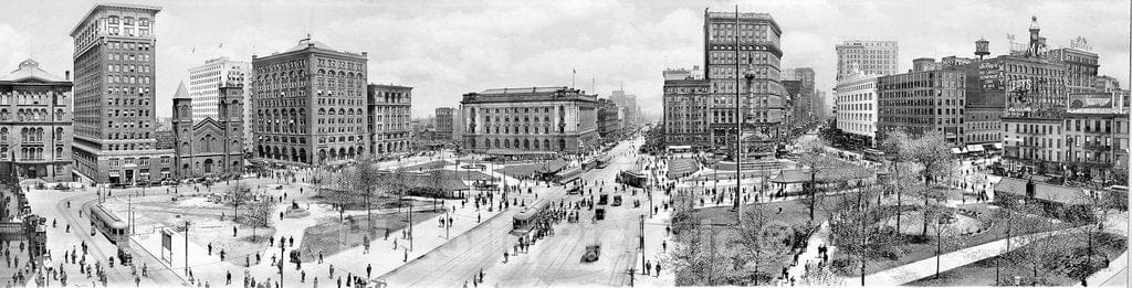 Public Square was designed as part of the city's original plan, laid out in the 1790's by Moses Cleaveland. Initially used as a common space for residents to come together and graze their animals, the square, and the city, grew with innovation and the