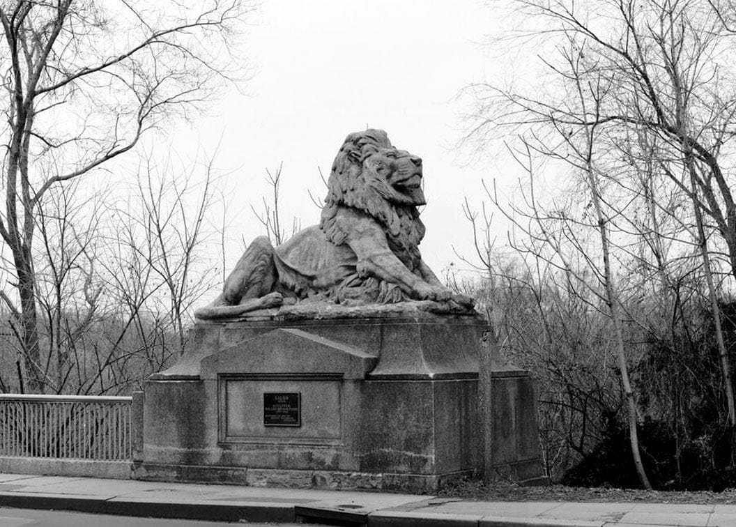 Detail showing restored lion, northwest corner of bridge. - Connecticut Avenue Bridge, Spans Rock Creek & Potomac Parkway at Connecticut Avenue, Washington, District of Columbia, DC
