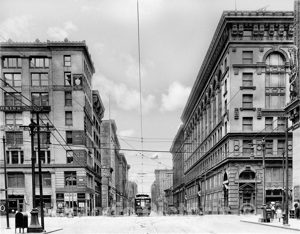 St. Louis Historic Black & White Photo, Trolley on Washington Avenue and Twelfth Street, c1914 -