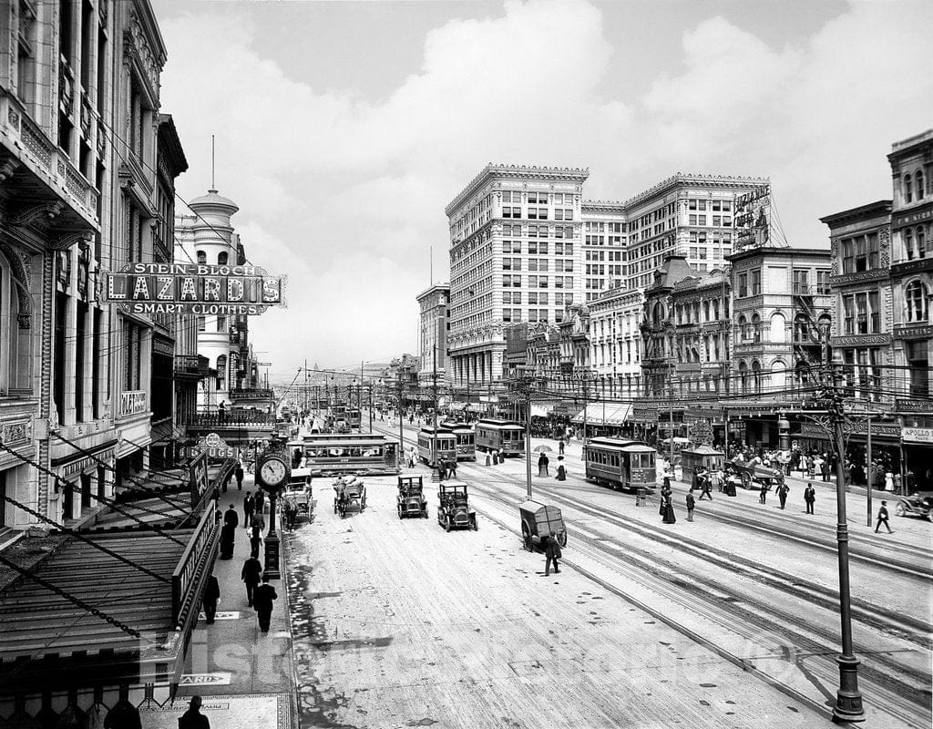 New Orleans Historic Black & White Photo, Traffic on Canal Street, c1910 -