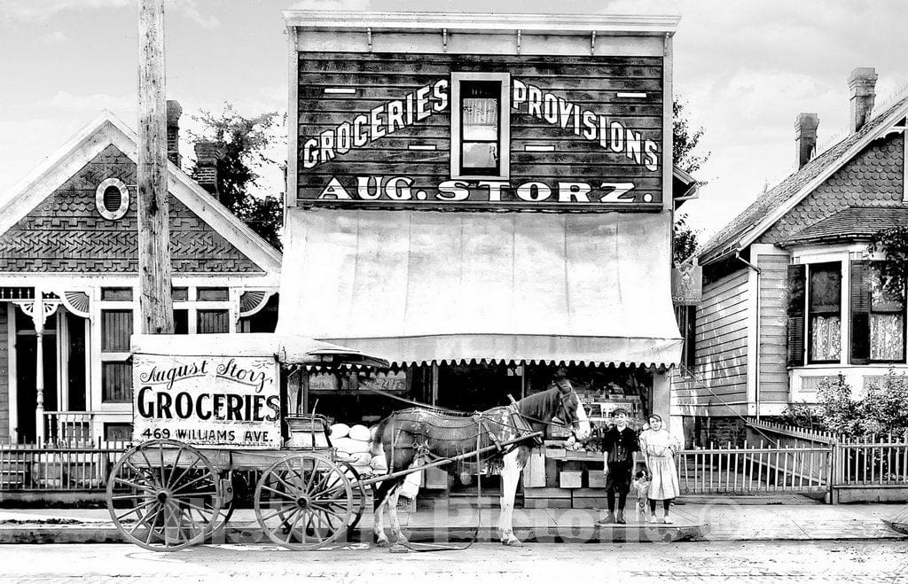 Portland Historic Black & White Photo, Outside August Storz Grocery, c1910 -