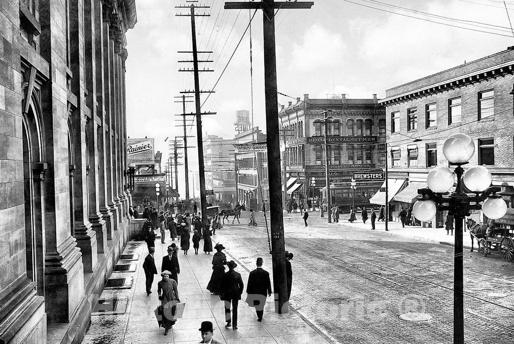 • .Seattle Historic Black & White Photo, Foot Traffic on Union Street and Third Avenue, c1911 -