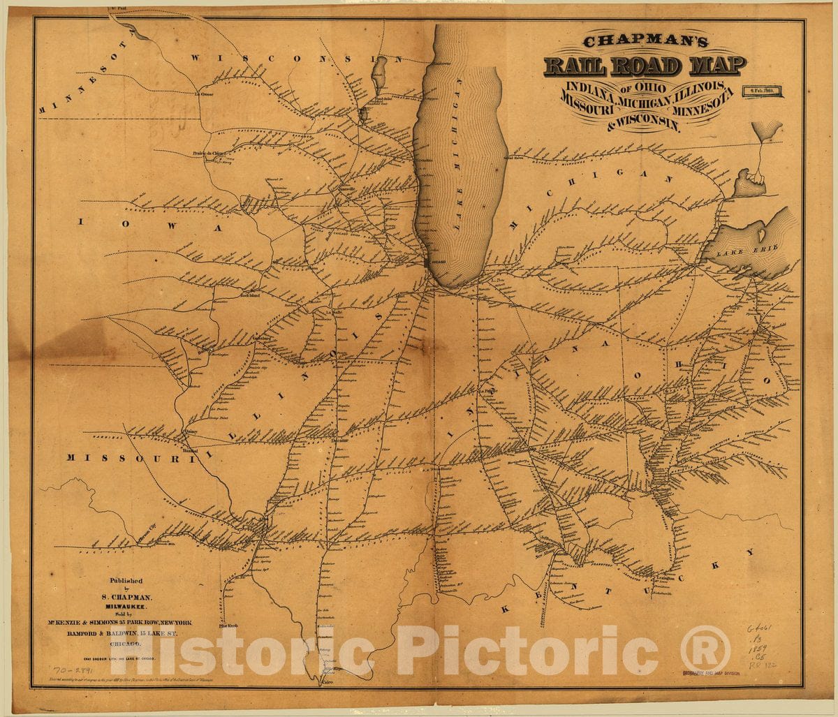 Historic 1859 Map - Chapman's Rail Road map of Ohio, Indiana, Michigan, Illinois, Missouri, Minnesota, Wisconsin.