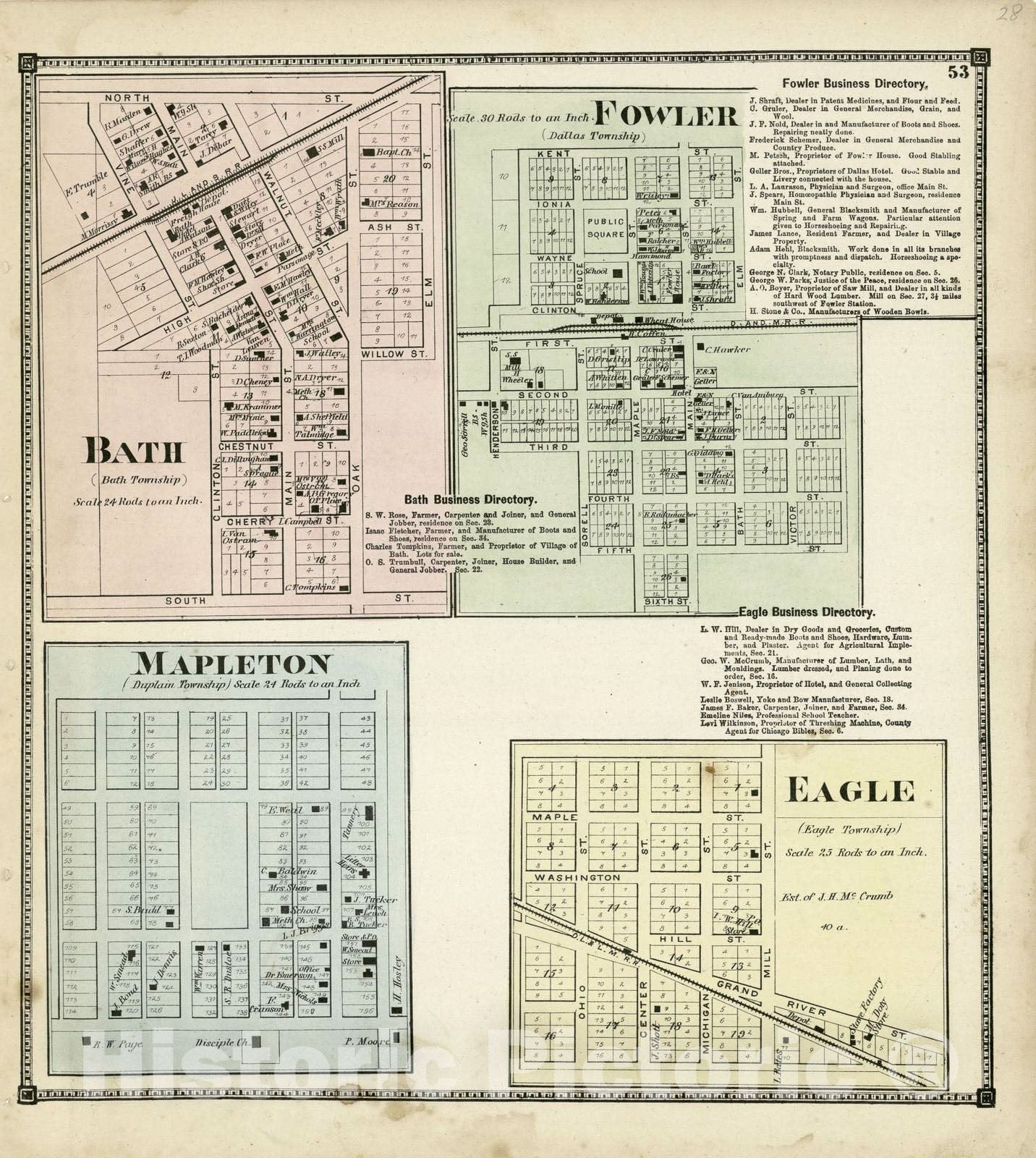 Historic 1873 Map - Atlas of Clinton County, Michigan - Bath; Fowler; Mapleton; Eagle