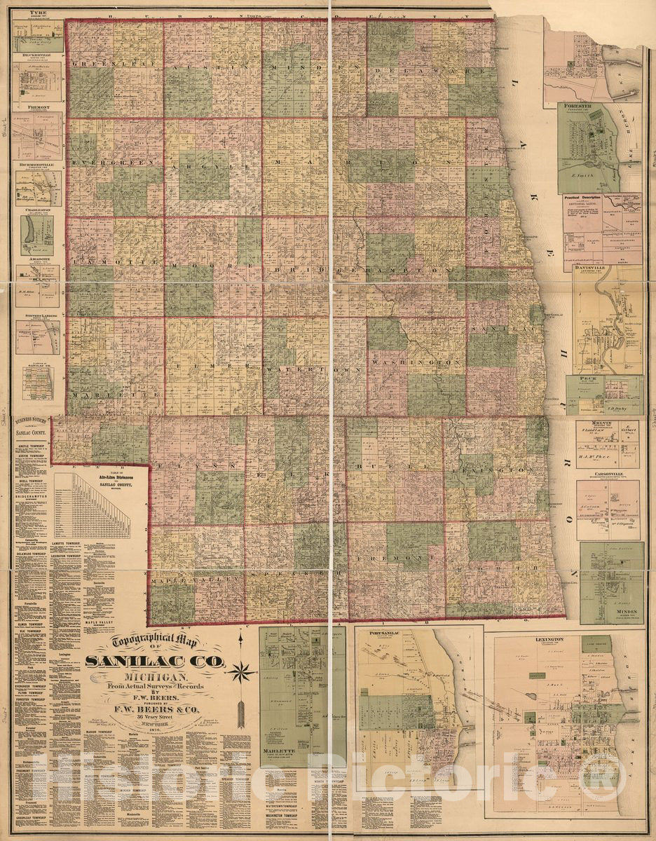 • .Historic 1876 Map - Topographical map of Sanilac Co, Michigan : from Actual surveys and Records