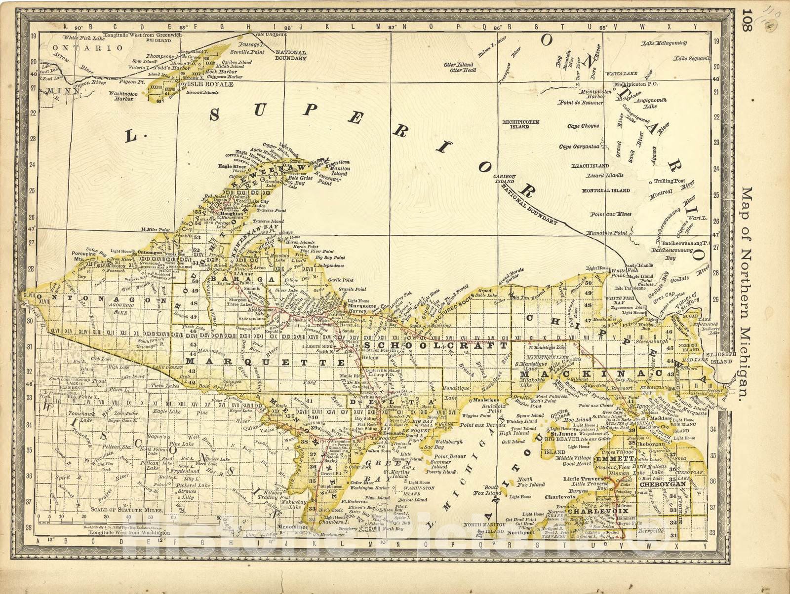 Historic 1881 Map - Historical Hand-Atlas, Illustrated - Map of Northern Michigan - Historical Hand Atlas, Illustrated, General & Local