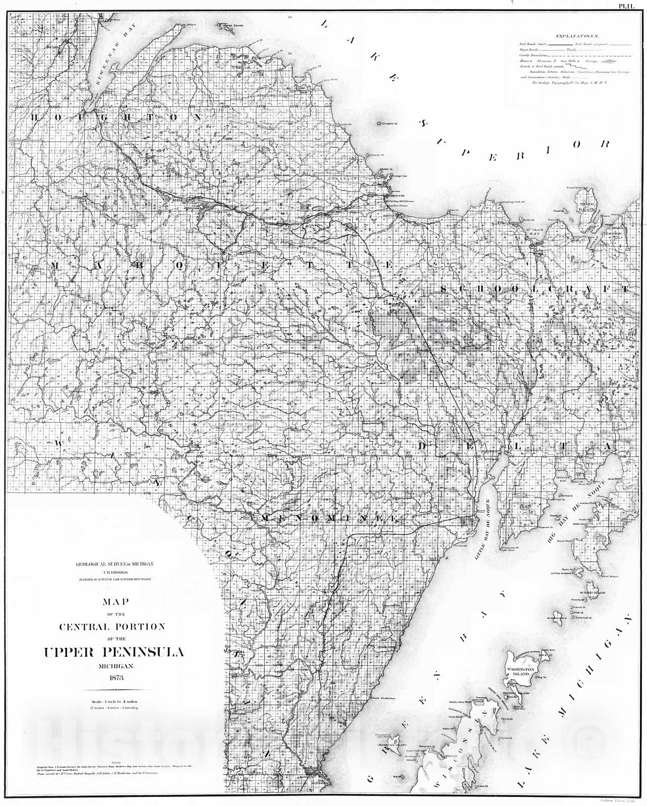 • .Historic Map : 1873 Map of the Central Portion of the Upper Peninsula, Michigan : Vintage Wall Art