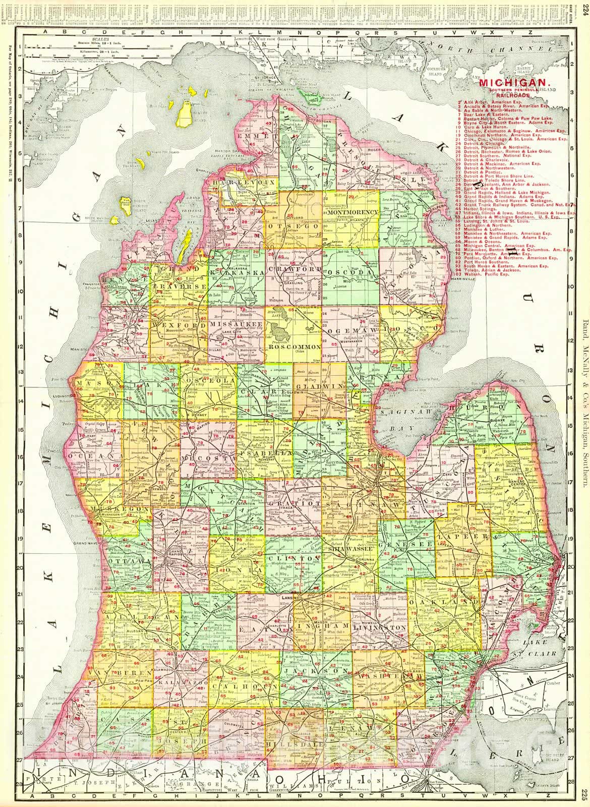 • .Historic Map : 1902 Rand McNally & Co.'s New Business Atlas Map of Michigan [Southern] : Vintage Wall Art